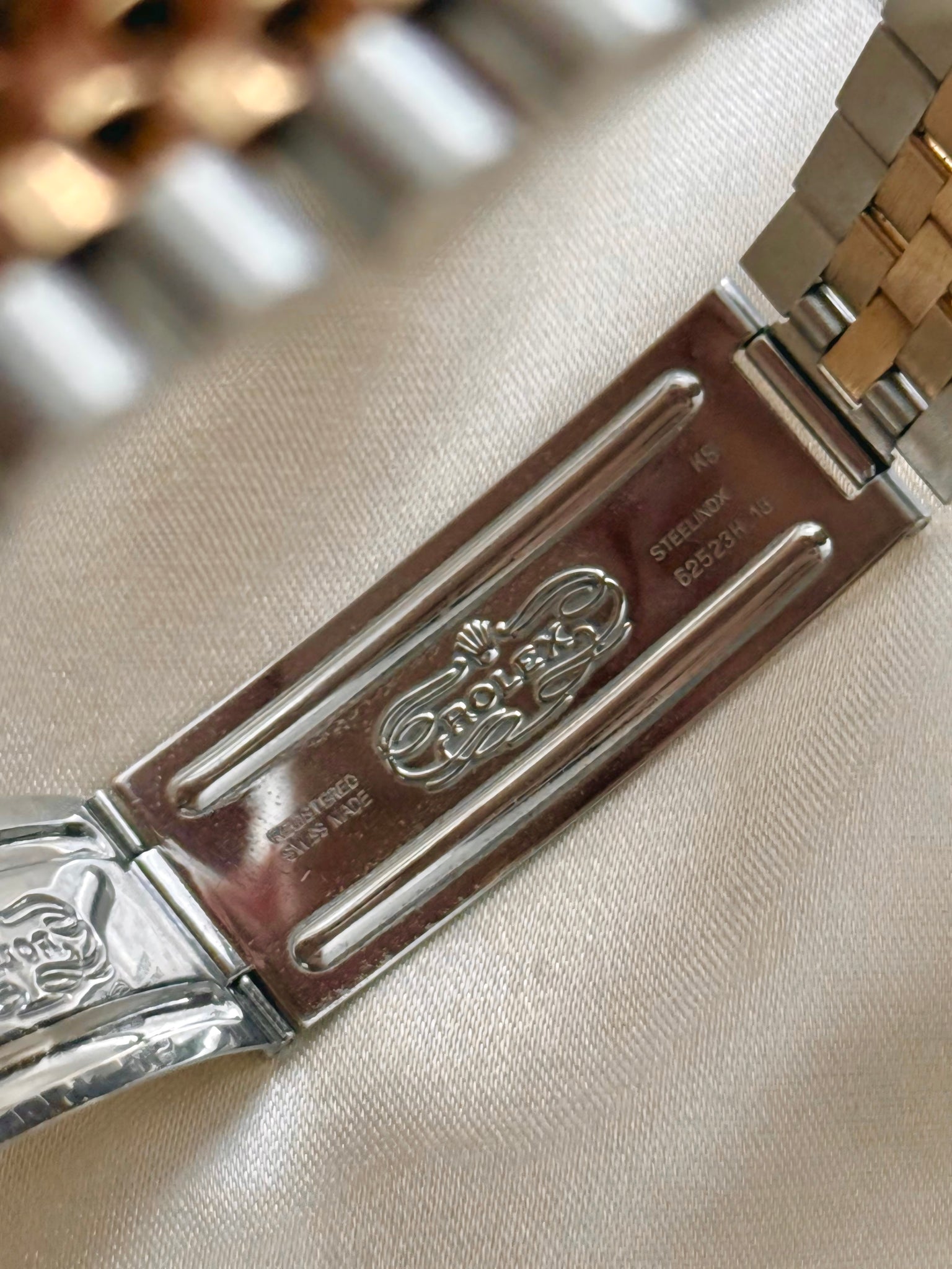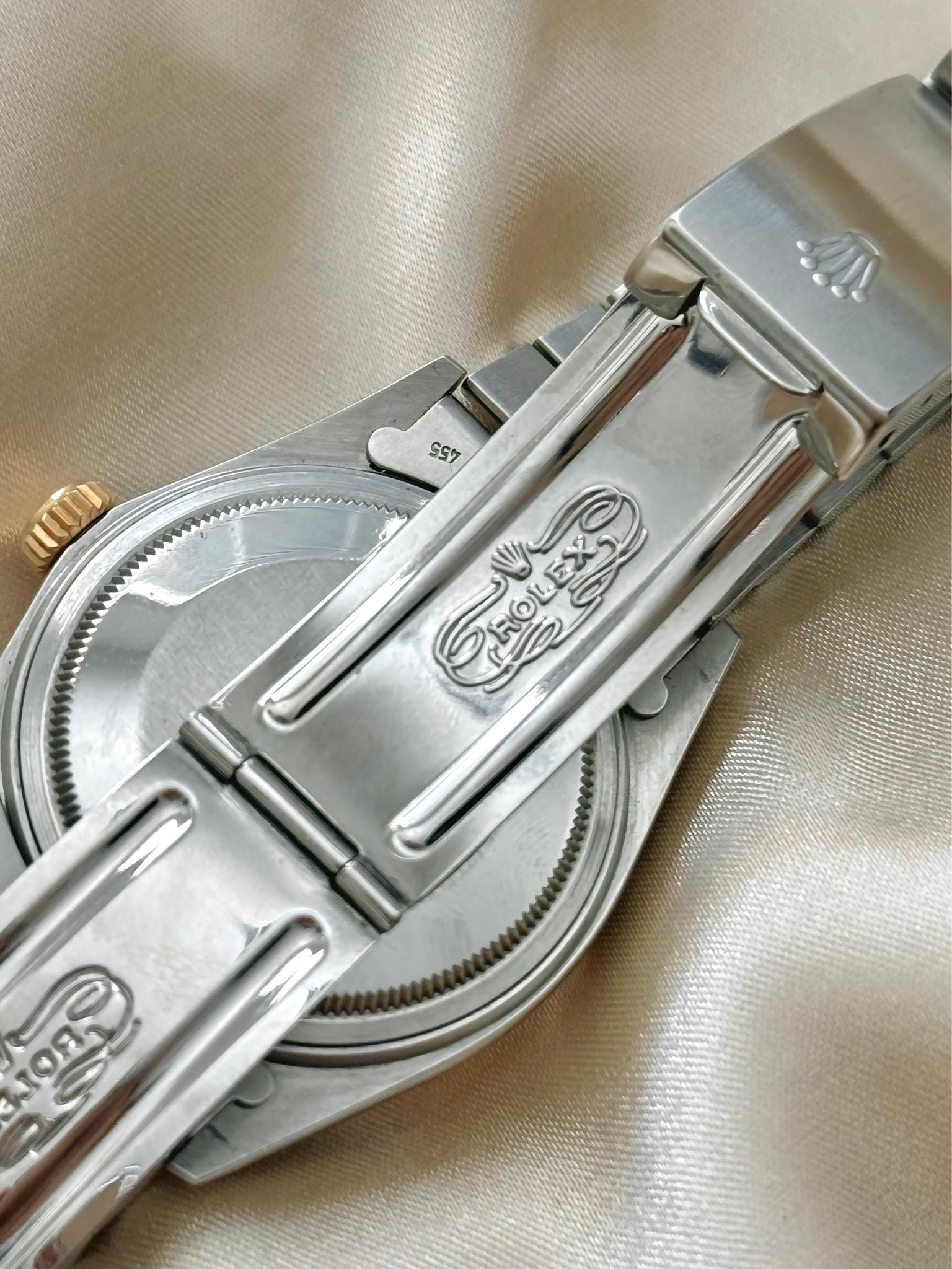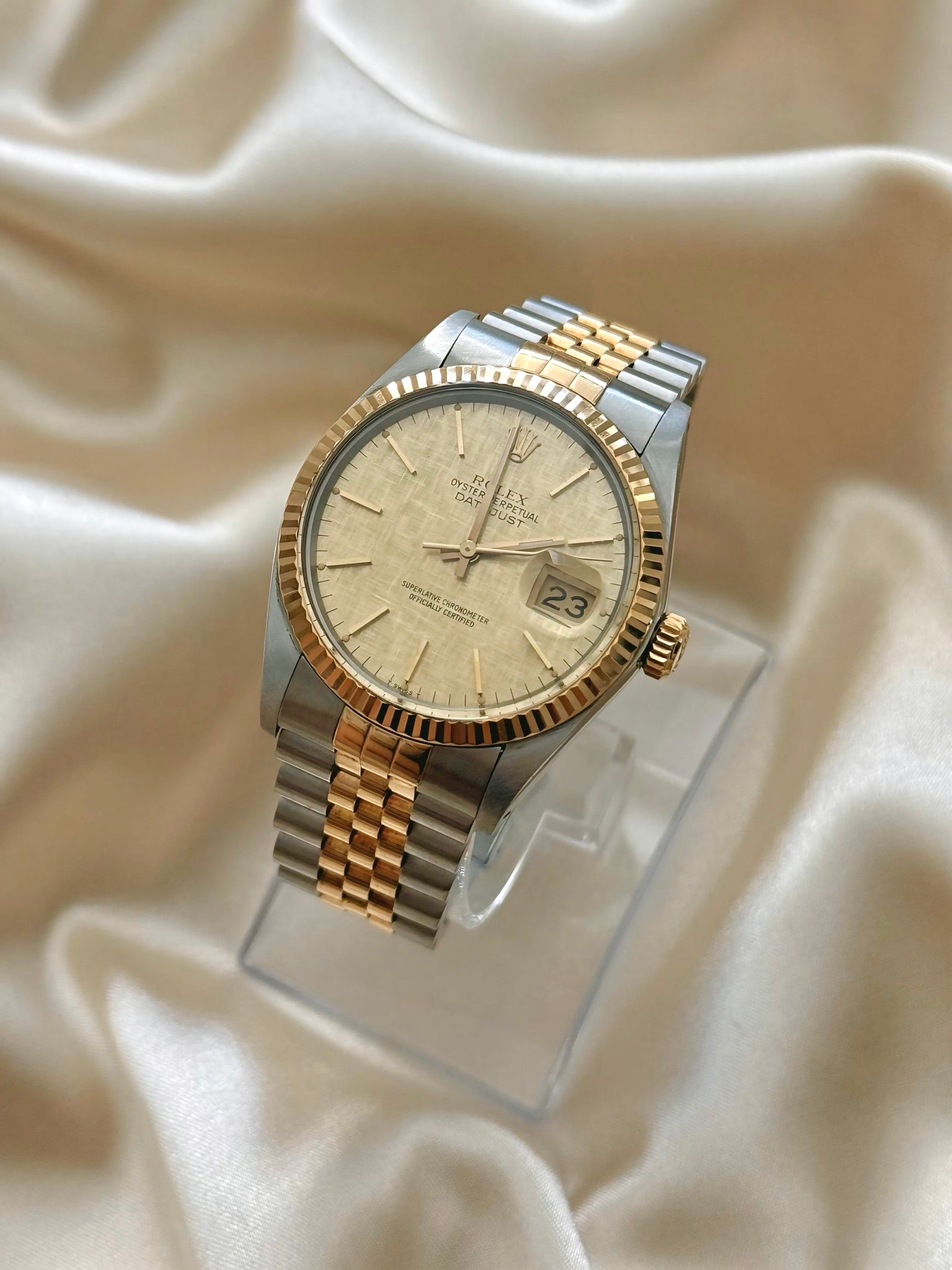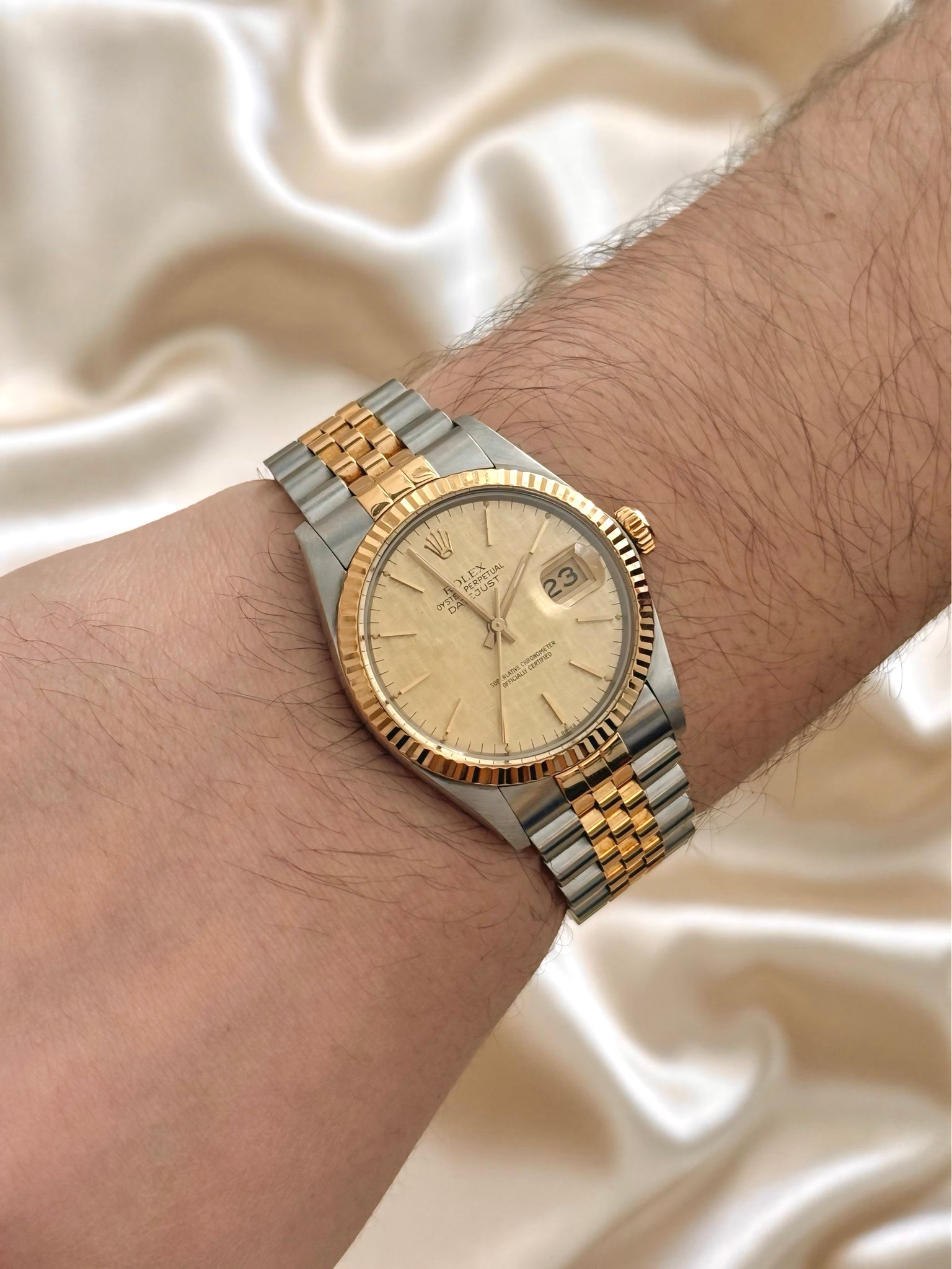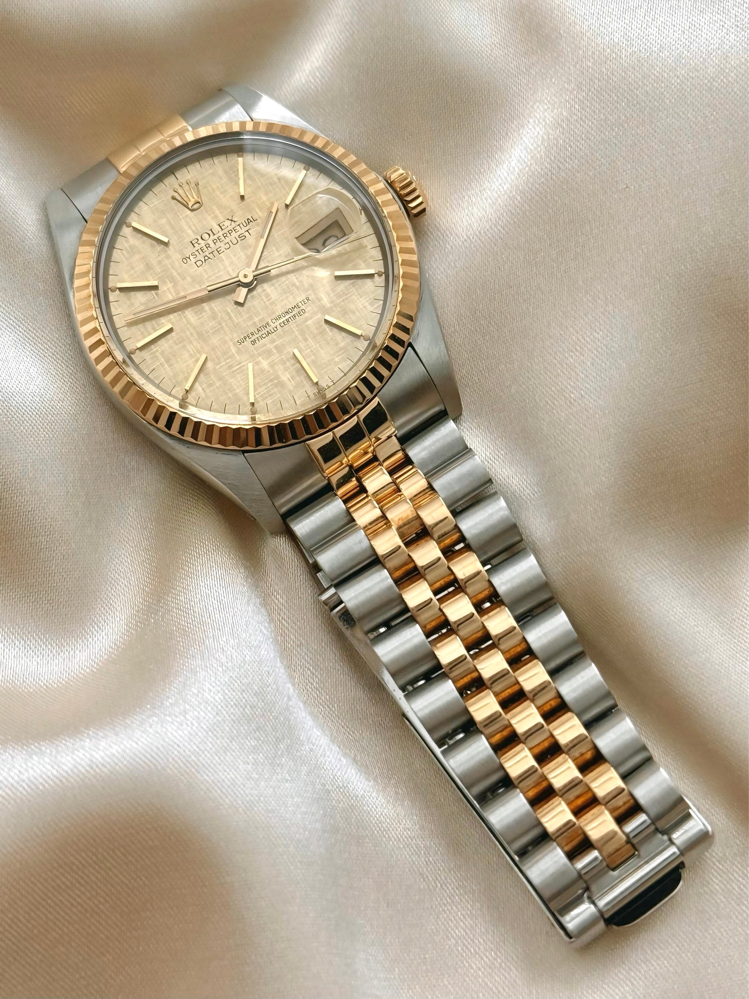 Men’s 36mm Rolex Datejust Ref. 16013 in two-tone 14k yellow gold and stainless steel, featuring a rare gold linen dial. This sought-after QUICKSET model is paired with the iconic Jubilee bracelet and presents in excellent, almost pristine pre-owned condition.