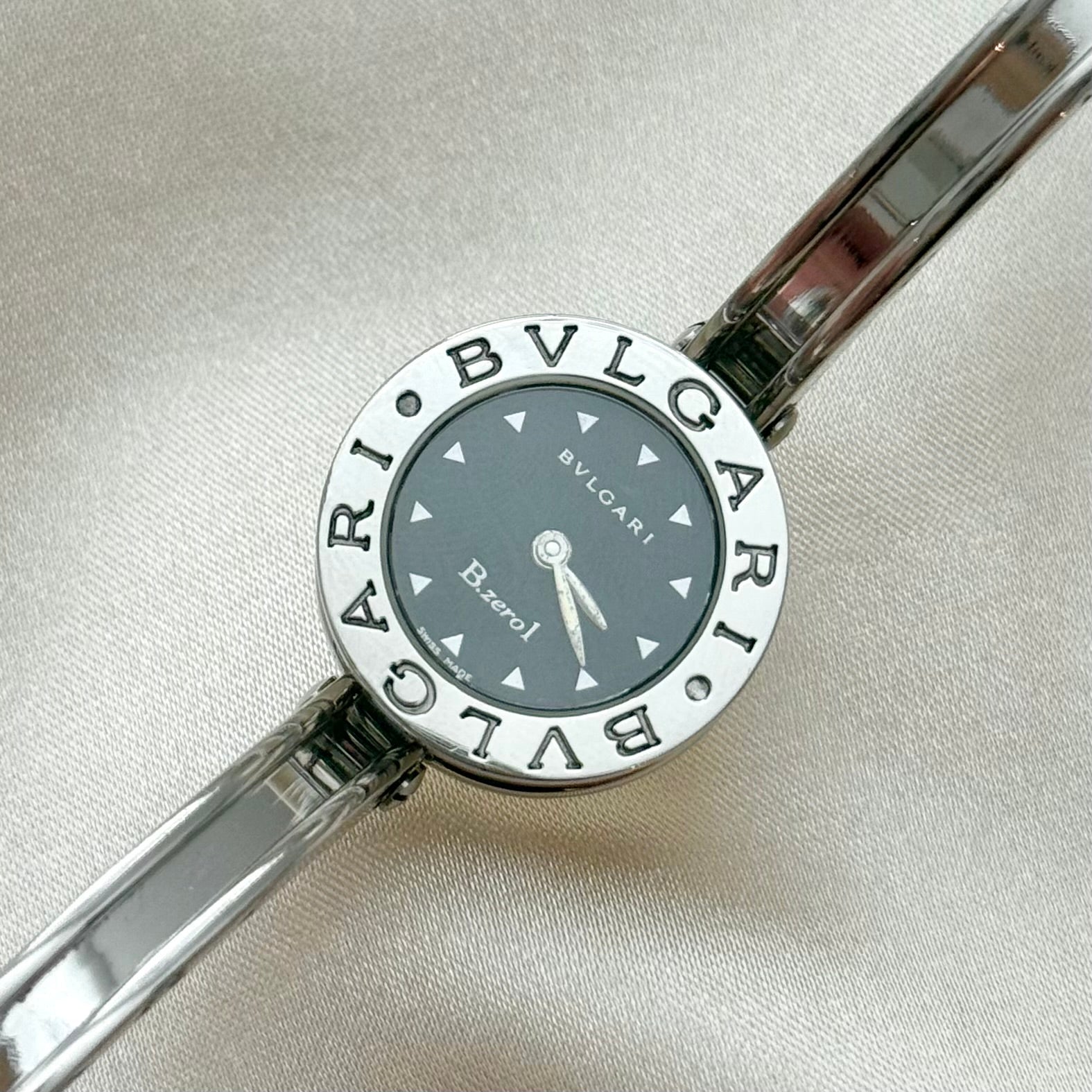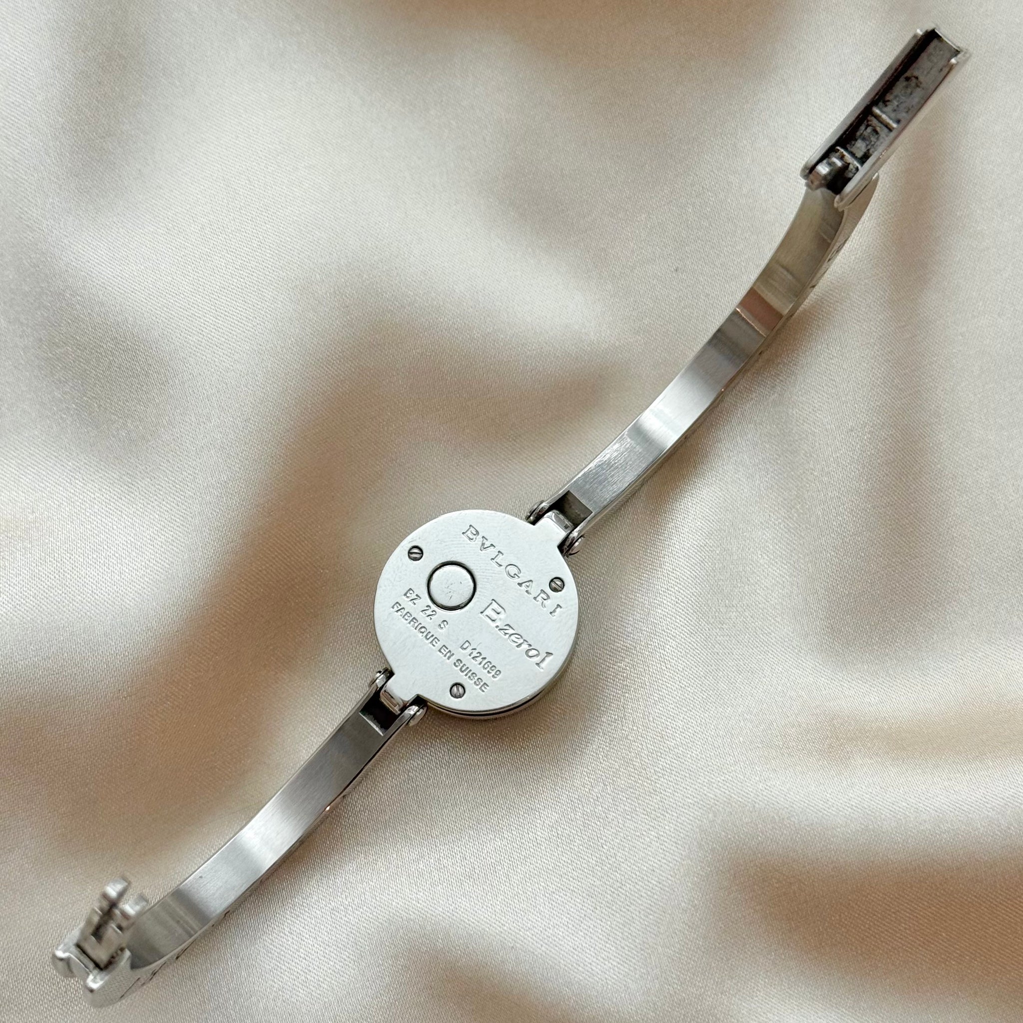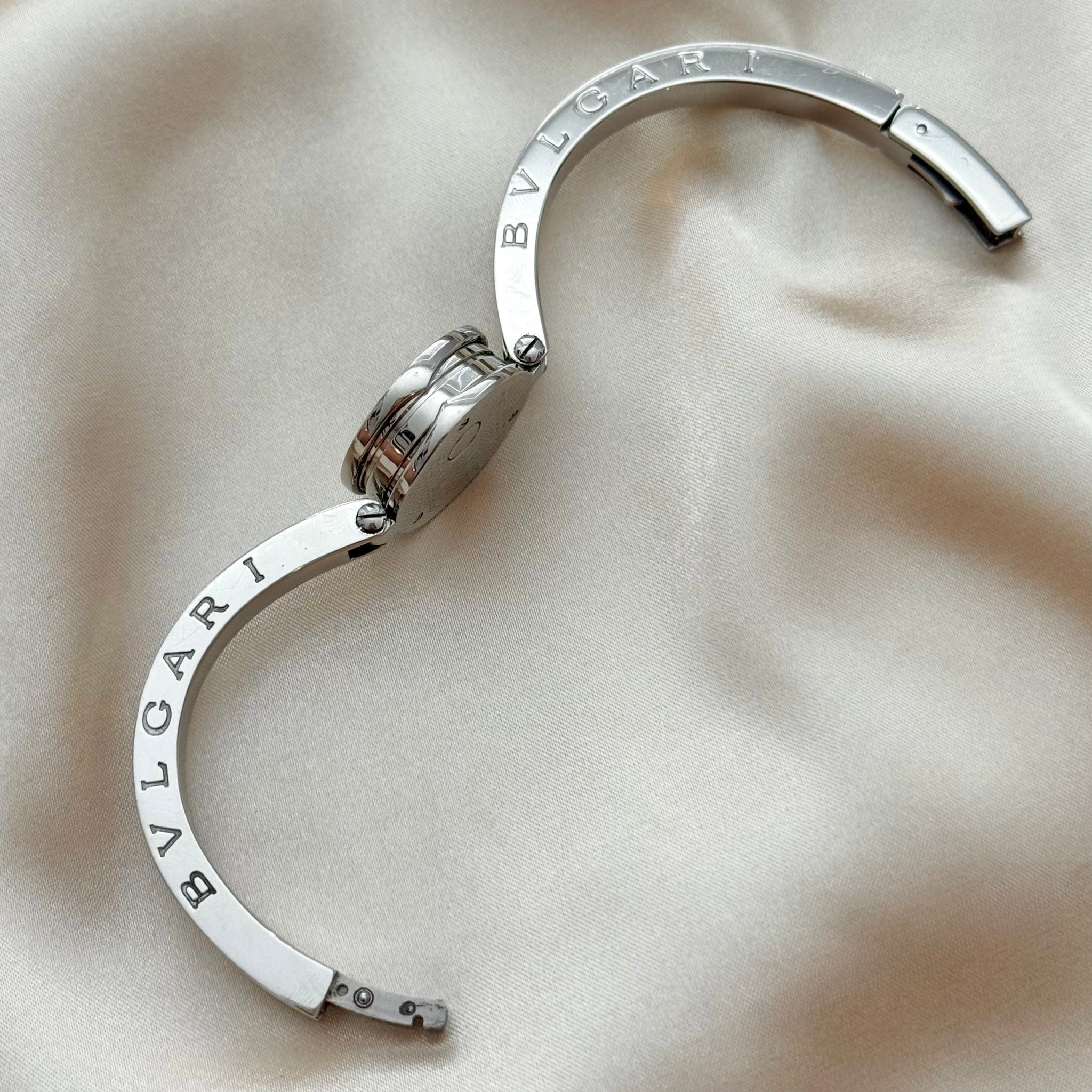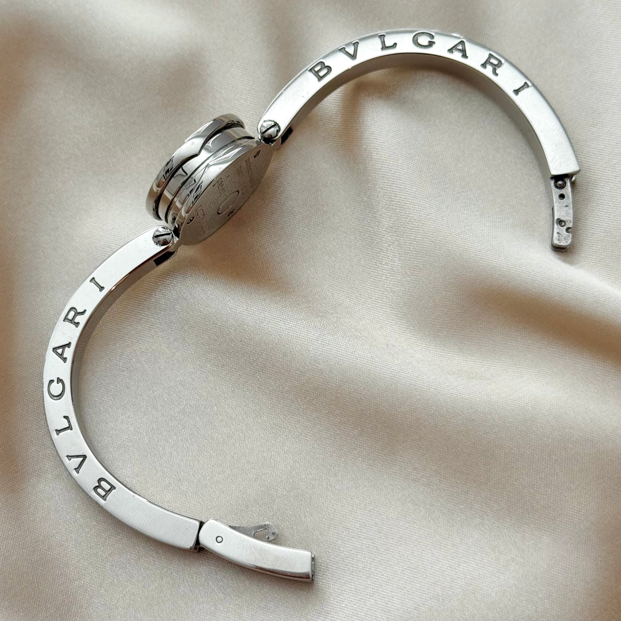 Gorgeous and rare vintage stainless steel Bulgari watch, featuring a striking black and silver dial and a cuff link–style bracelet with secure closure.