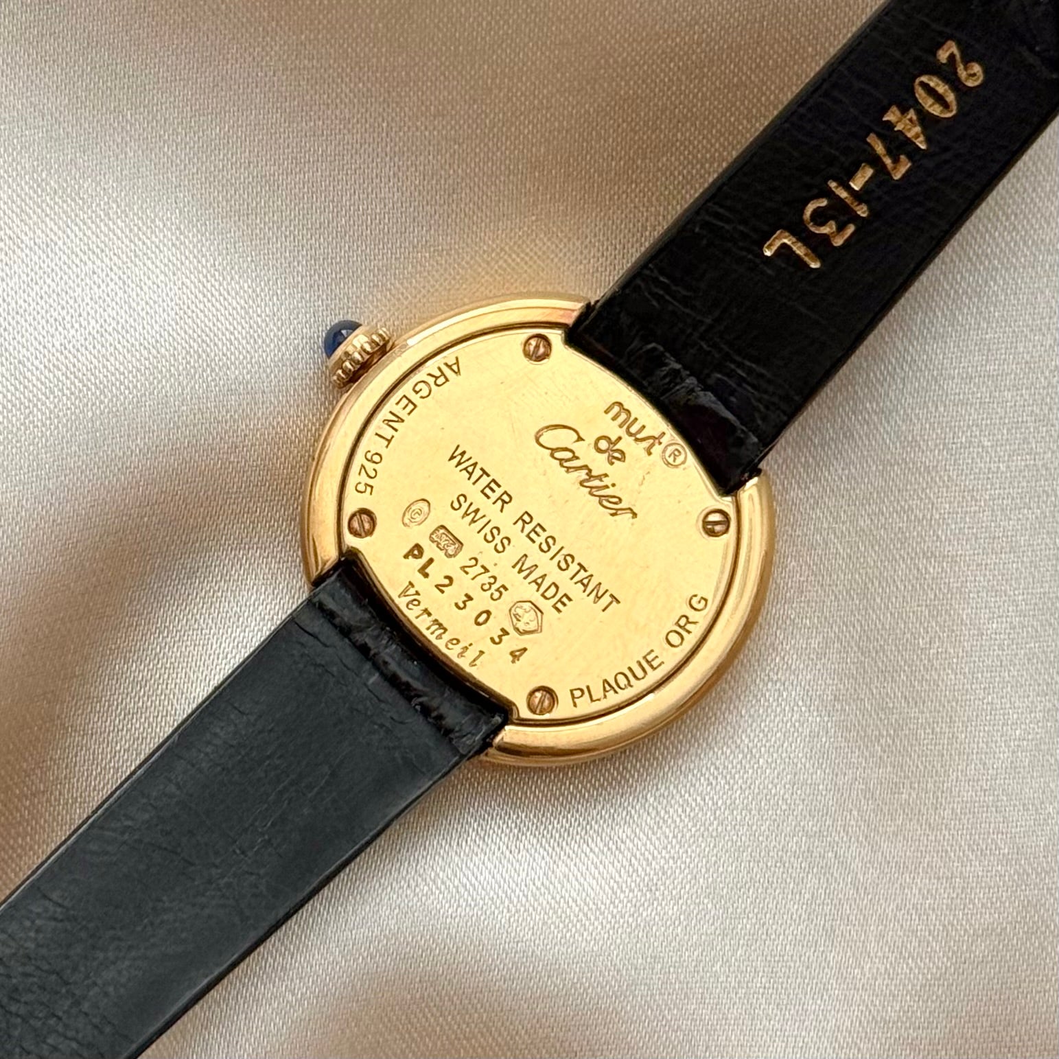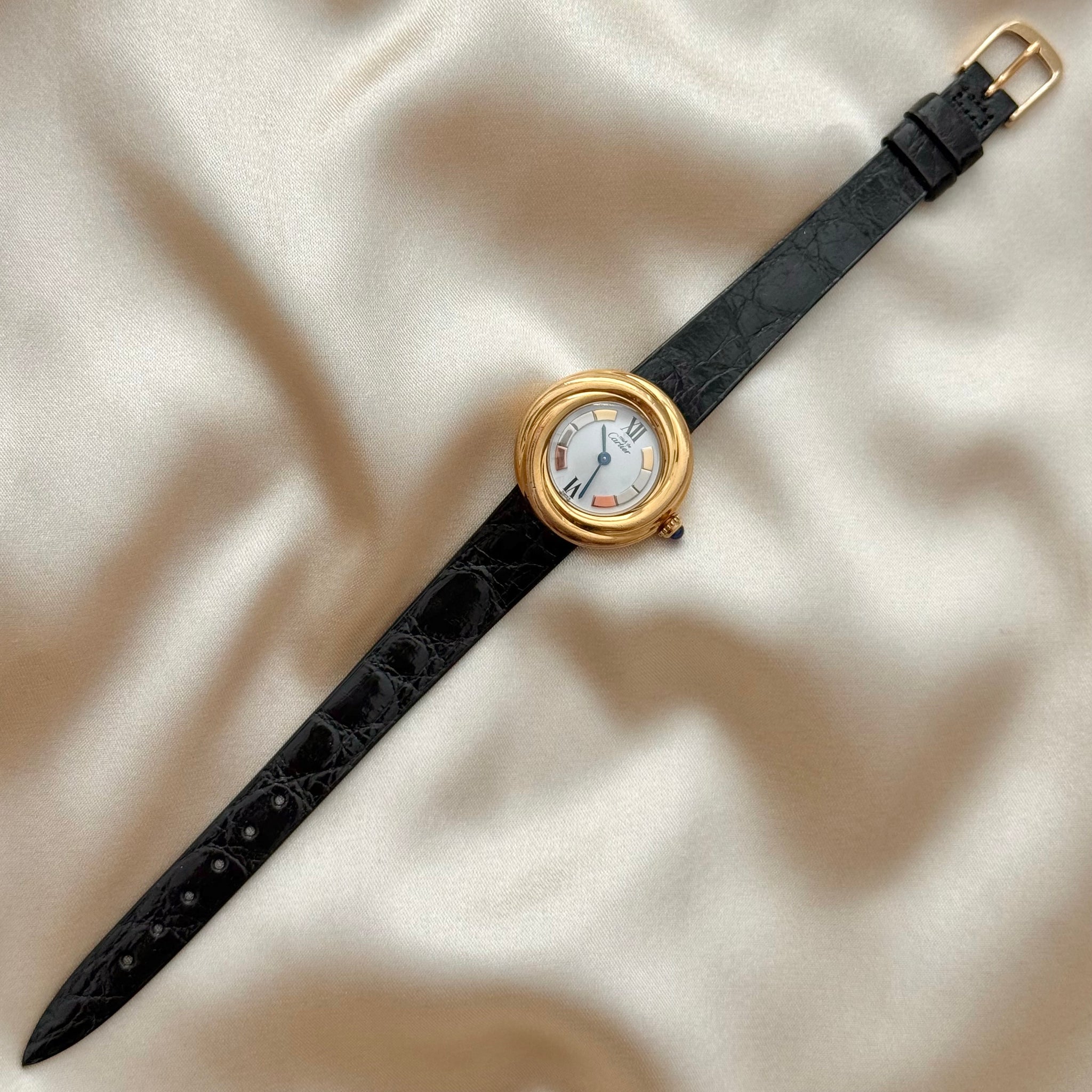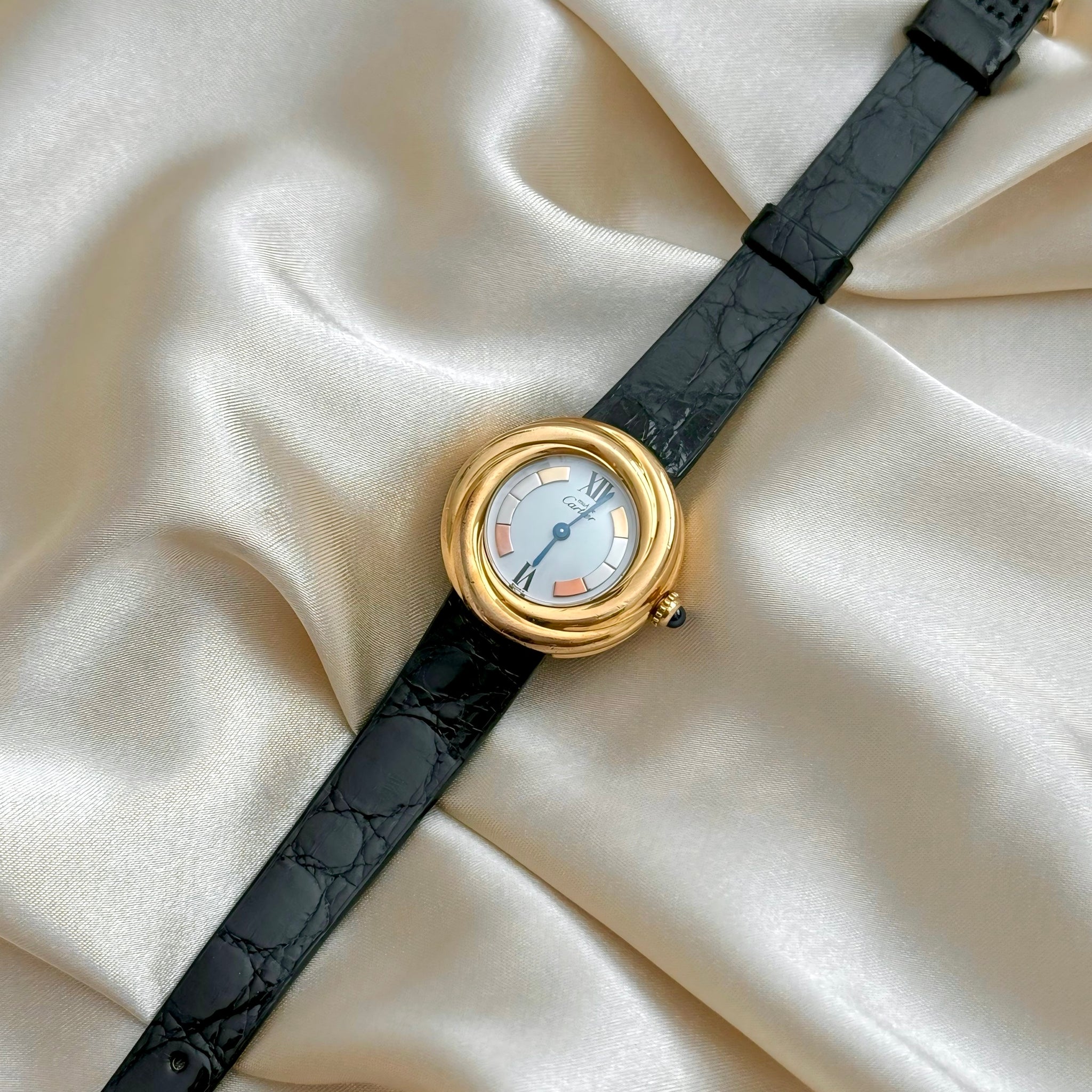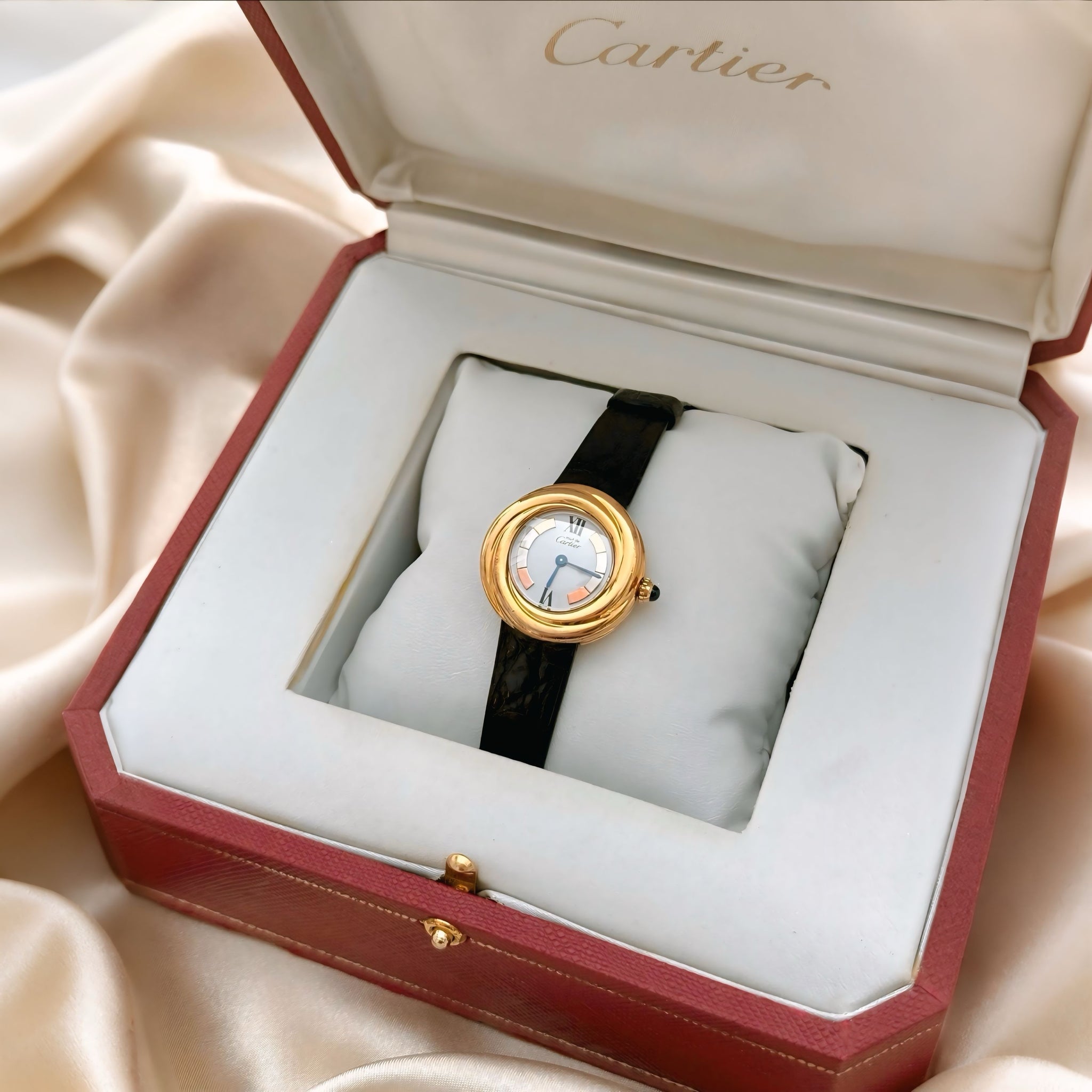 Elegant and extremely rare vintage Cartier watch featuring a gold vermeil Trinity case and a white signature Trinity dial, paired with a black aftermarket genuine leather strap. Comes with its original Cartier box.