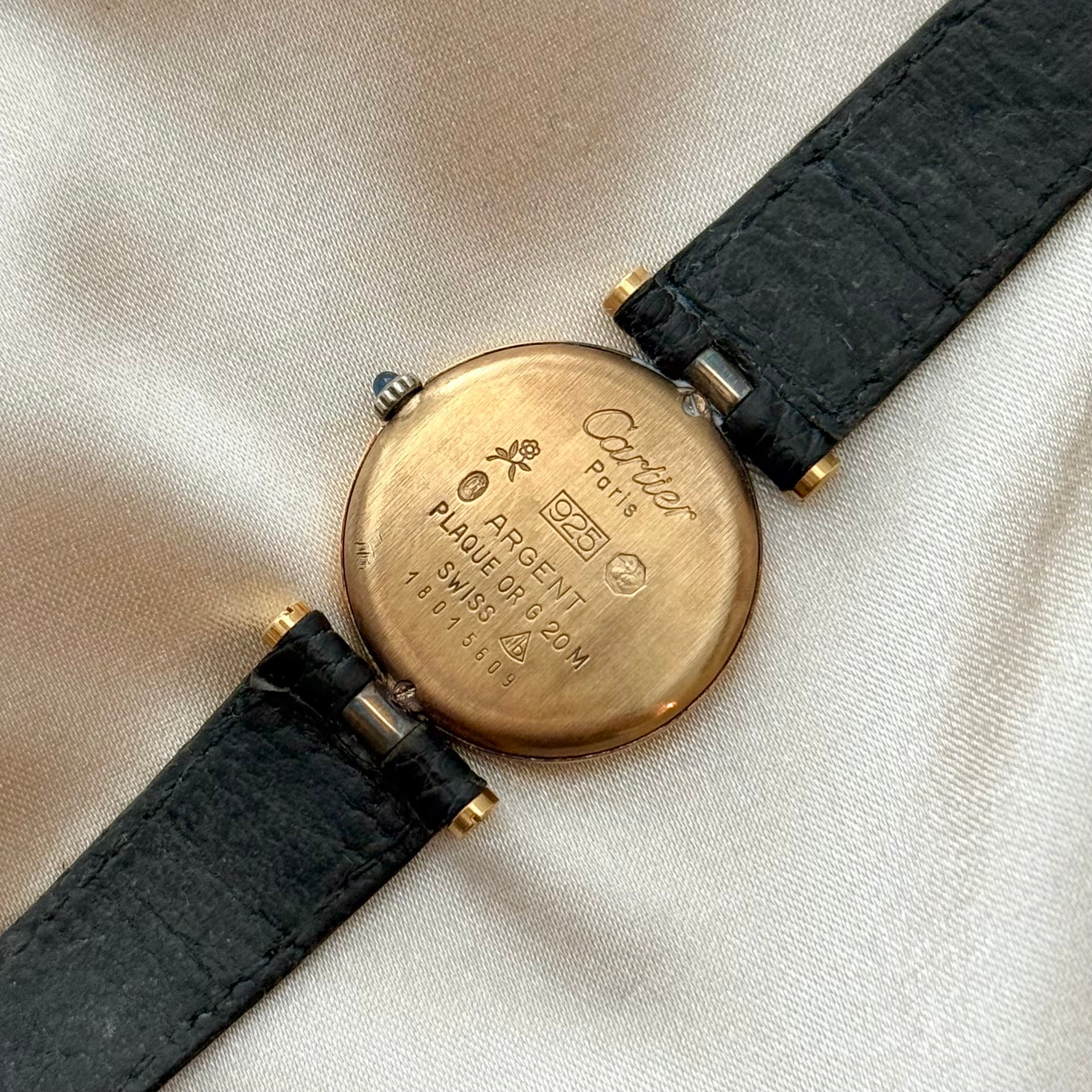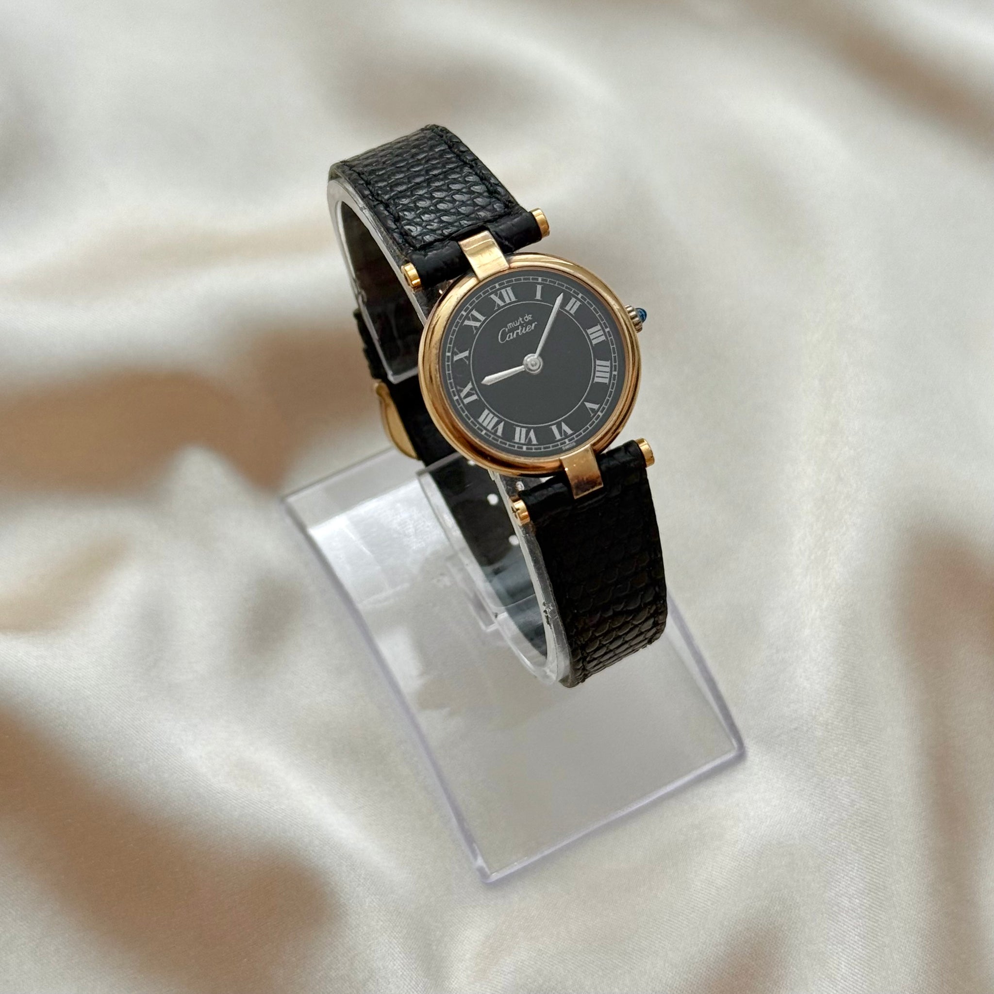 Stunning vintage Must de Cartier watch featuring gold vermeil and a sleek black Roman numeral dial, paired with a beautiful black authentic genuine leather strap and classic buckle closure.