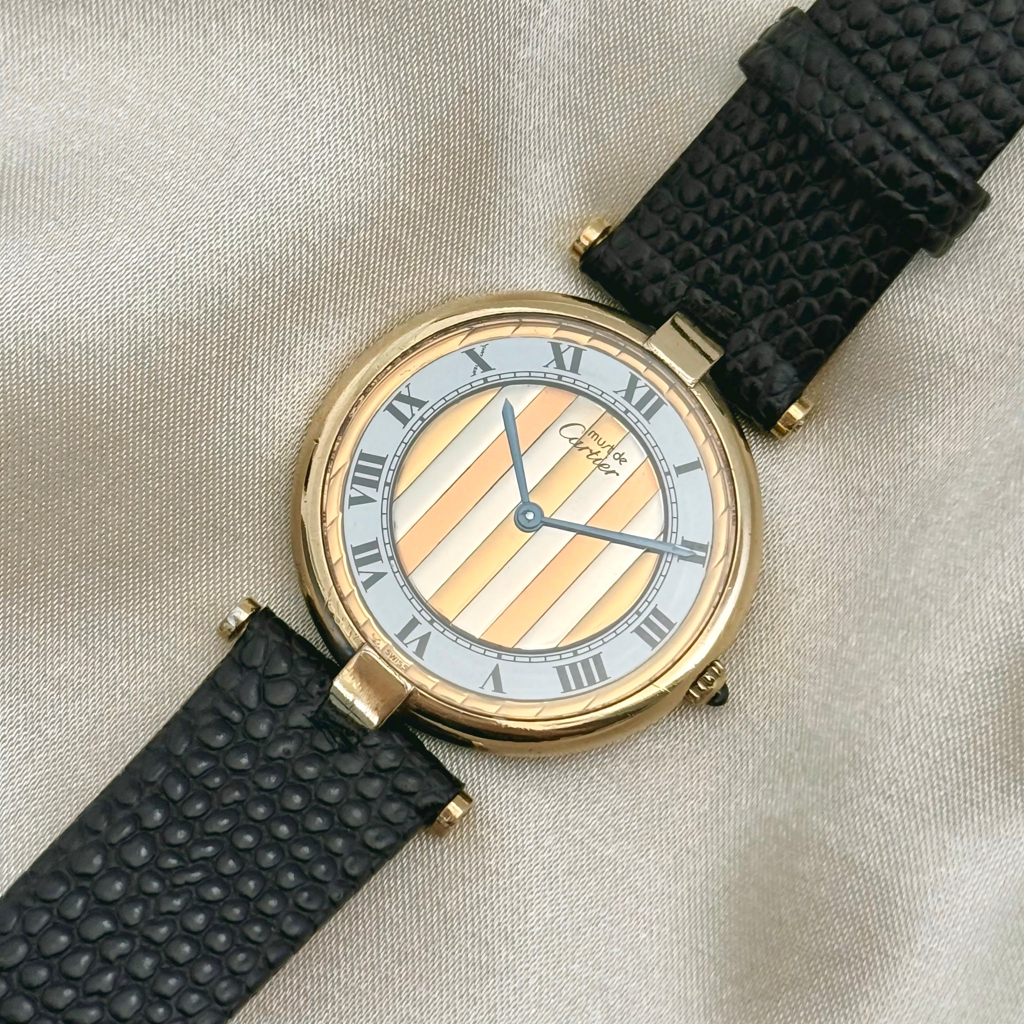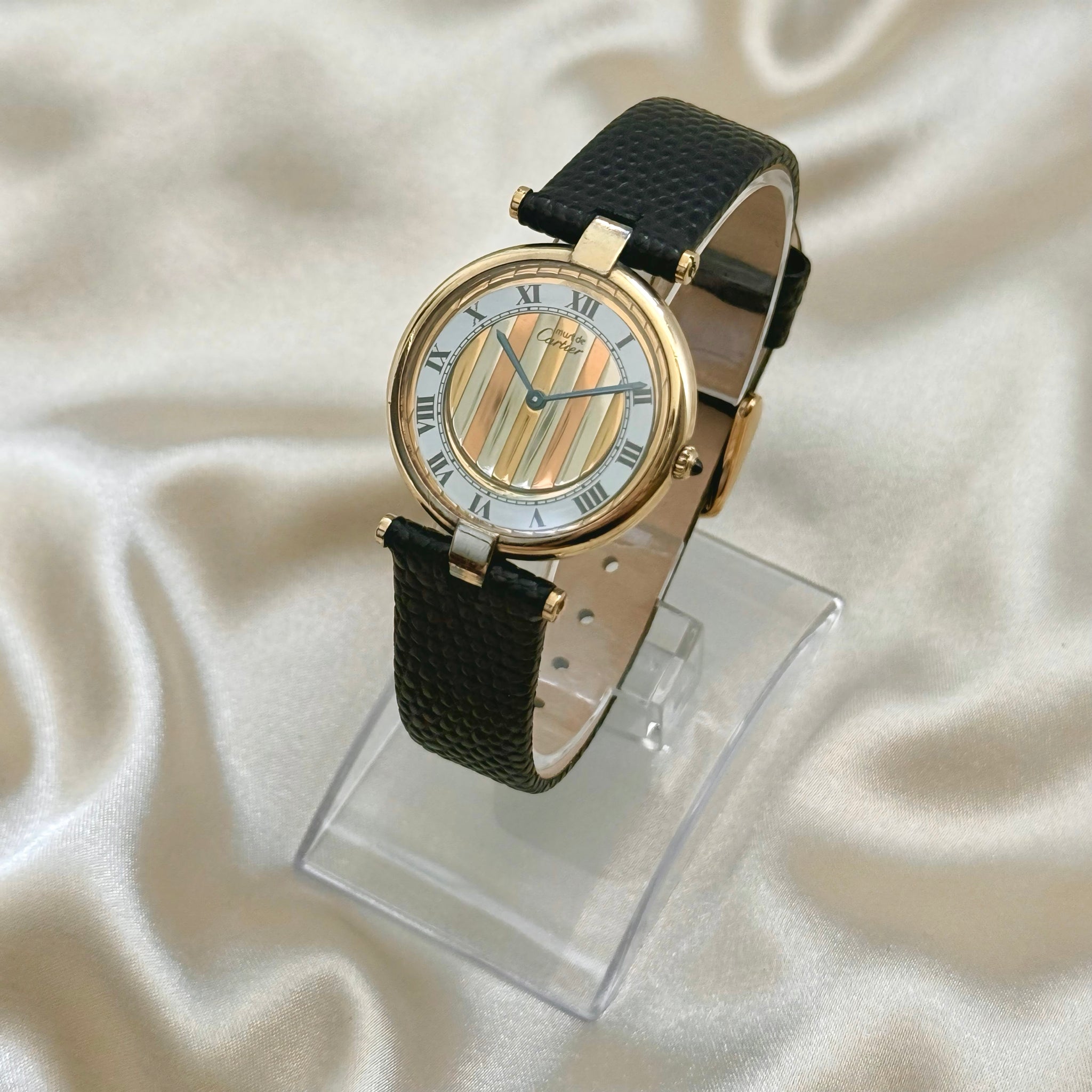Beautiful vintage Must de Cartier watch featuring a gold vermeil case and the signature Cartier Trinity dial, paired with a black aftermarket genuine leather strap. Comes with its original Cartier box and travel case.