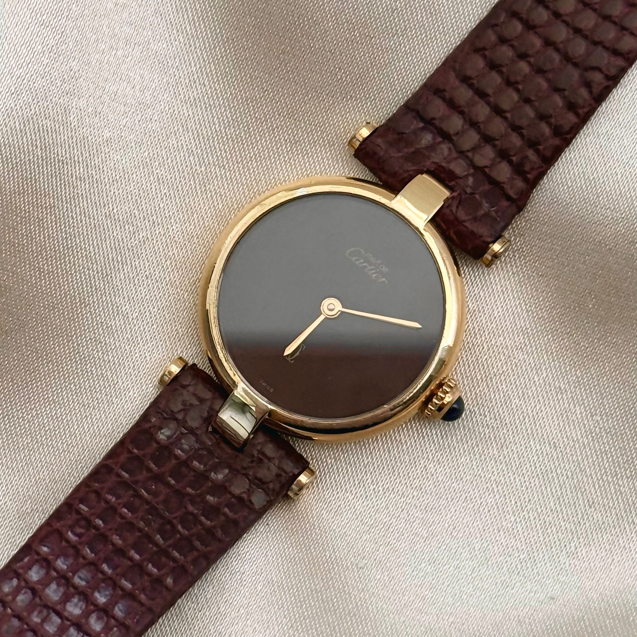 Beautiful vintage Must de Cartier watch featuring a gold vermeil case and a burgundy dial, paired with a burgundy aftermarket genuine leather strap. Comes with its original Cartier box.