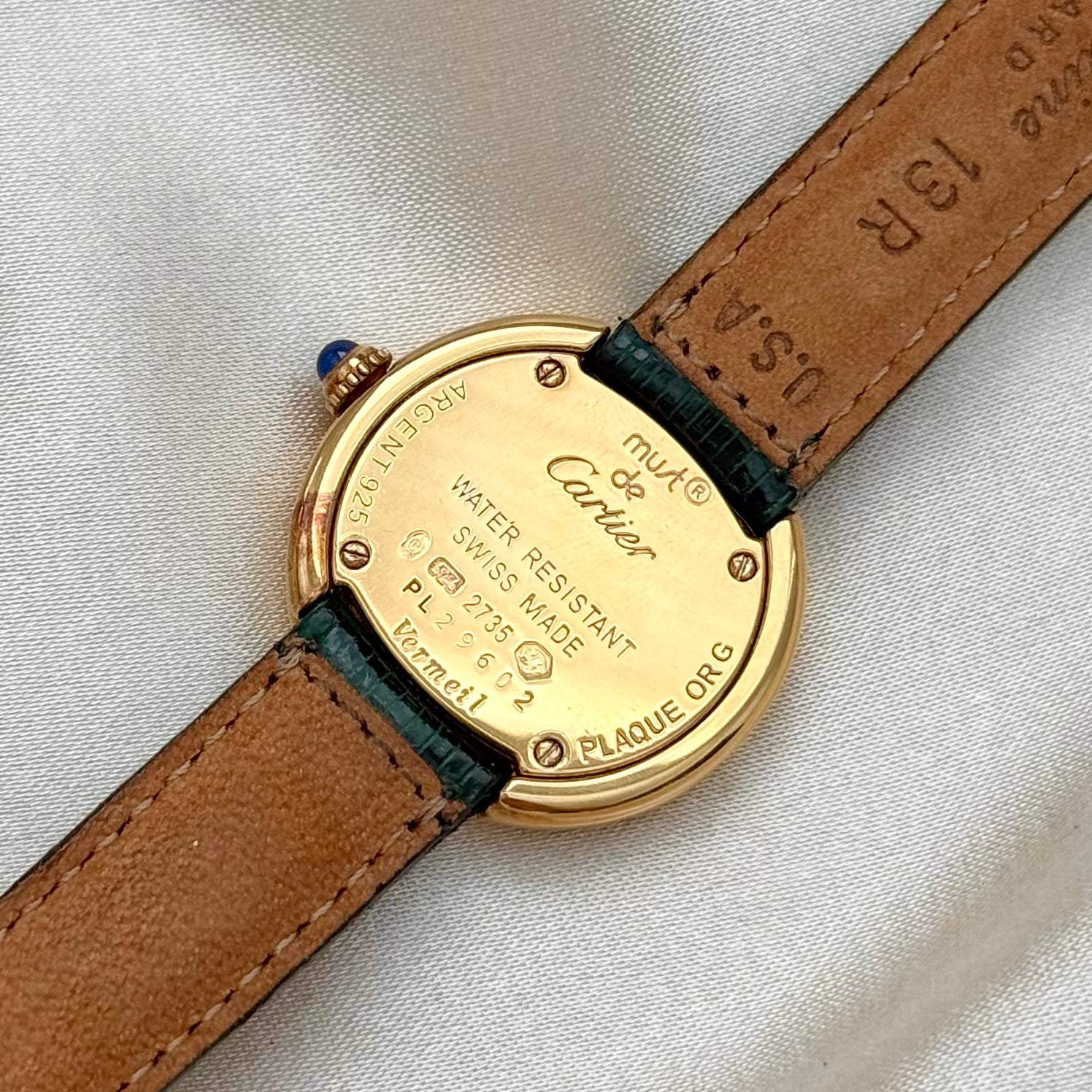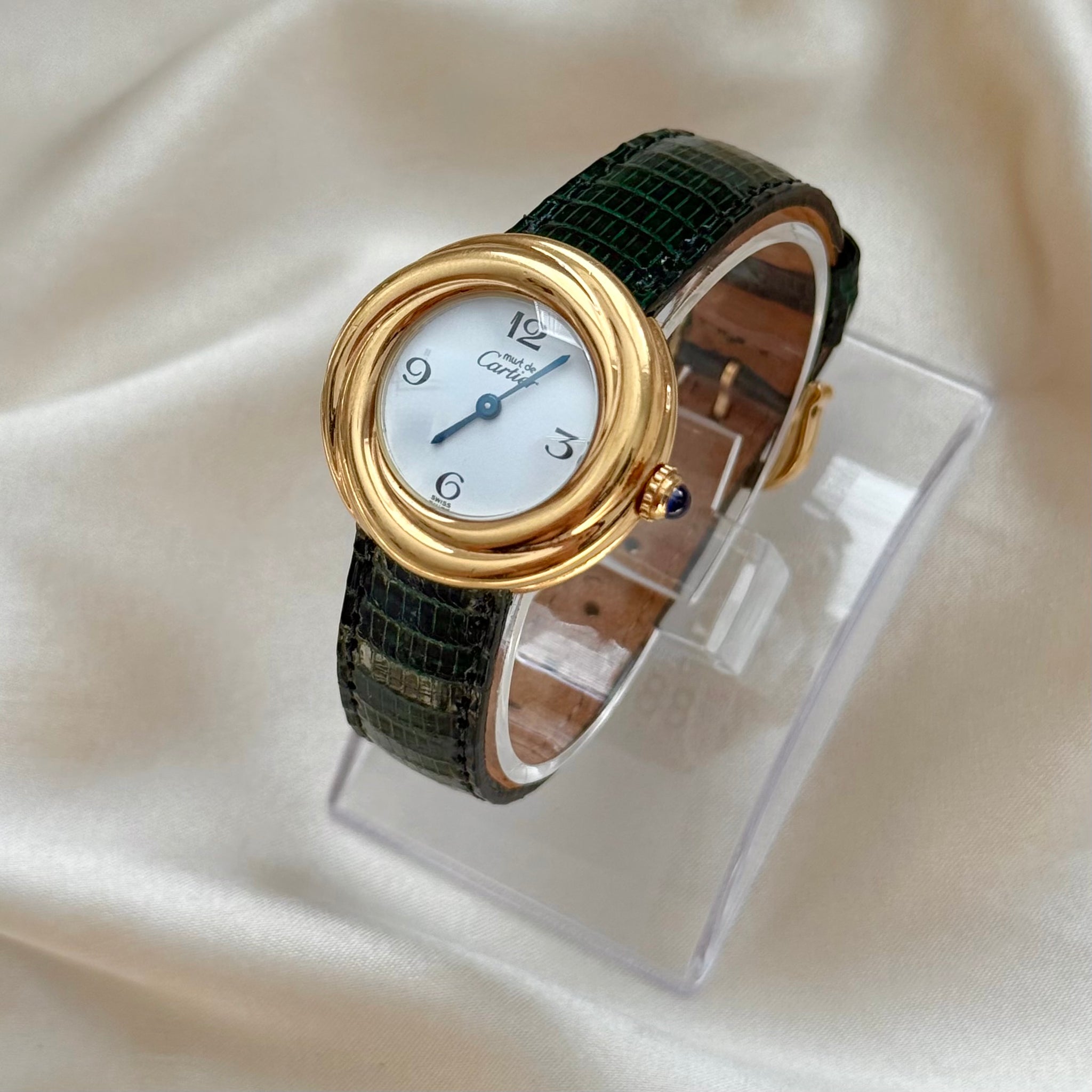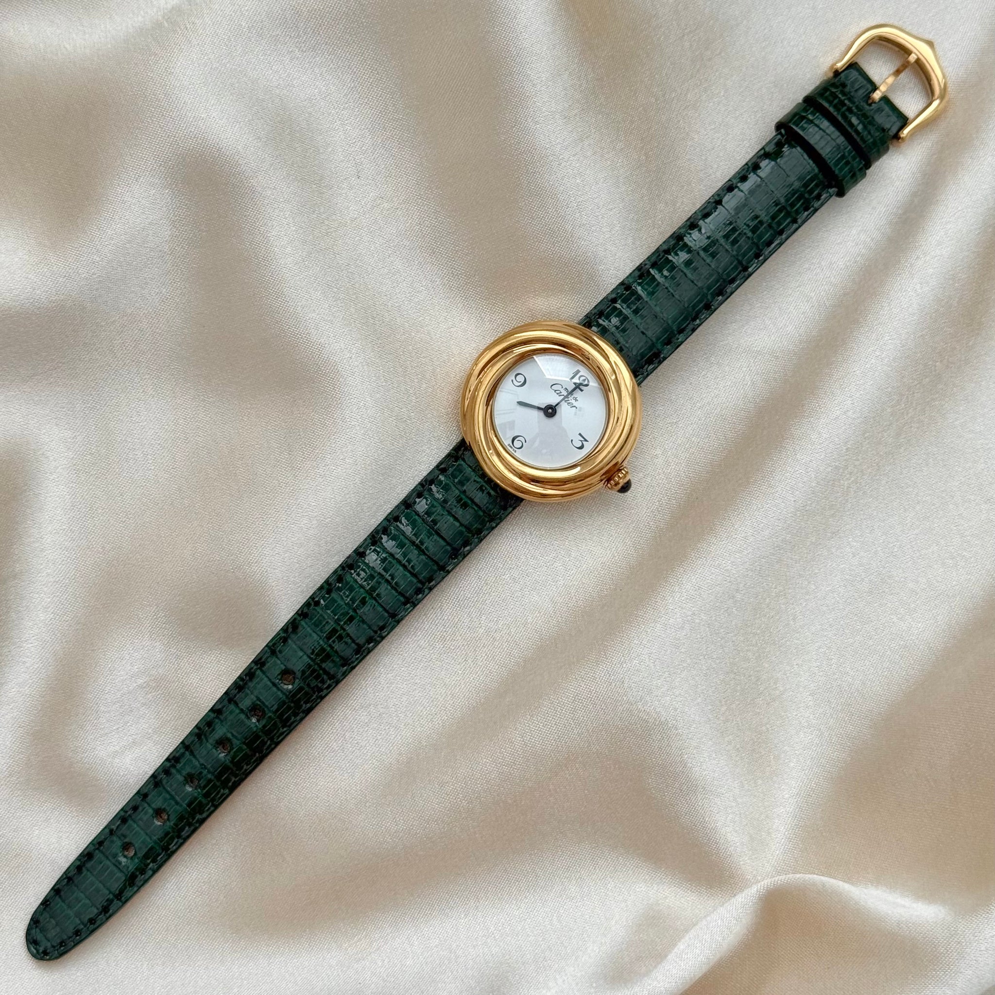 Elegant and extremely rare vintage Cartier watch featuring a gold vermeil Trinity case and a classic white dial, paired with a green aftermarket genuine leather strap. Comes with its original Cartier box.