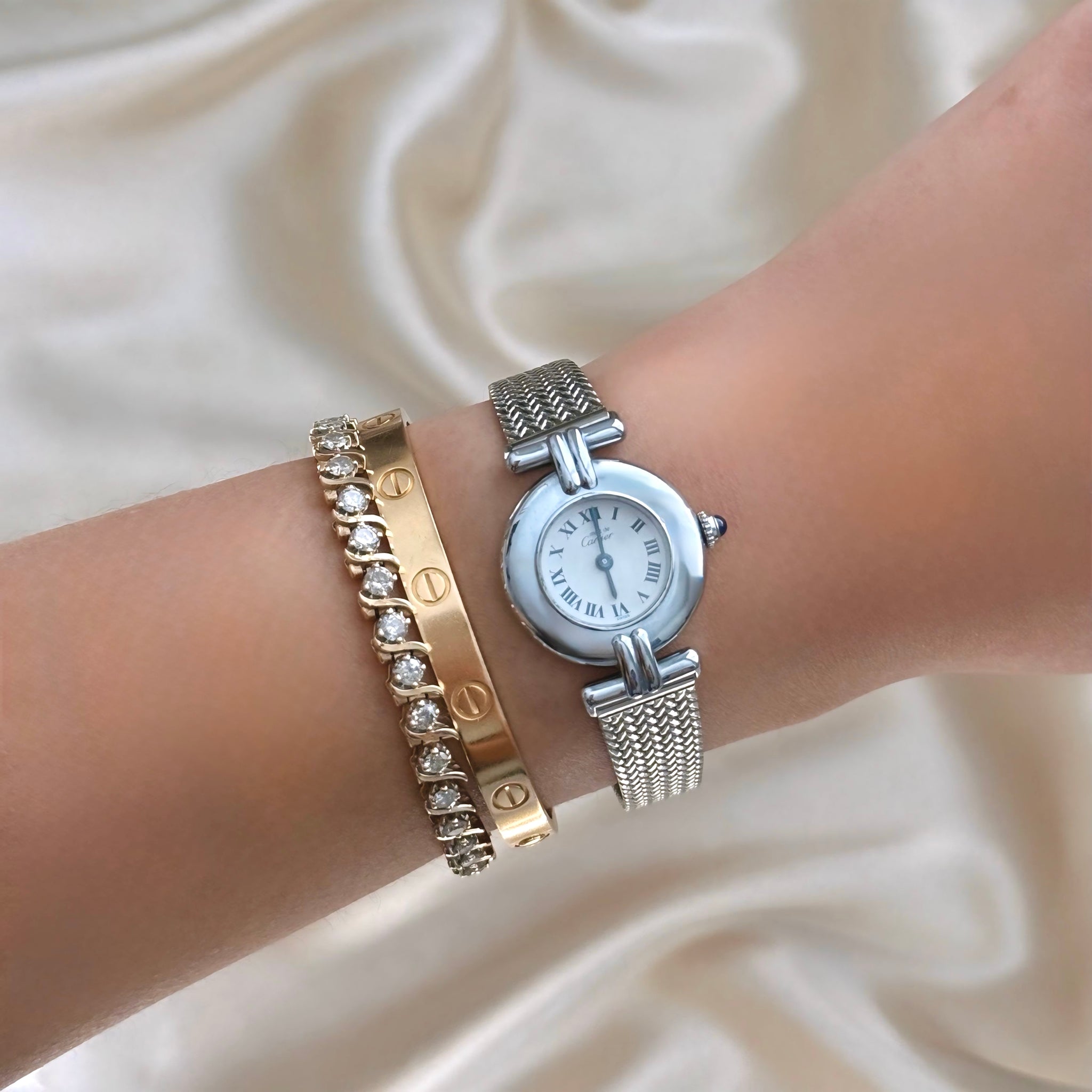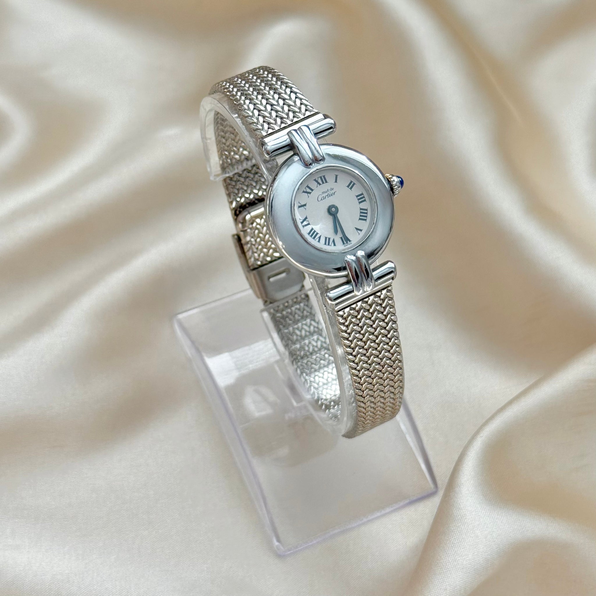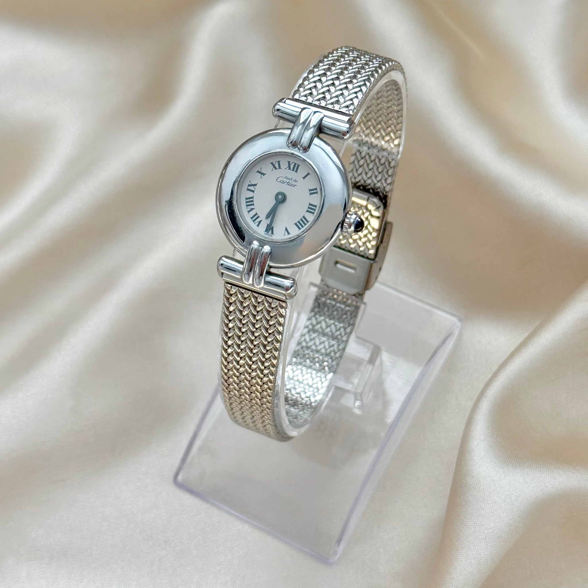 Elegant vintage Must de Cartier watch featuring a silver stainless steel case and a classic white dial, paired with a silver stainless steel aftermarket strap for a refined, timeless look. Includes its original Cartier box.