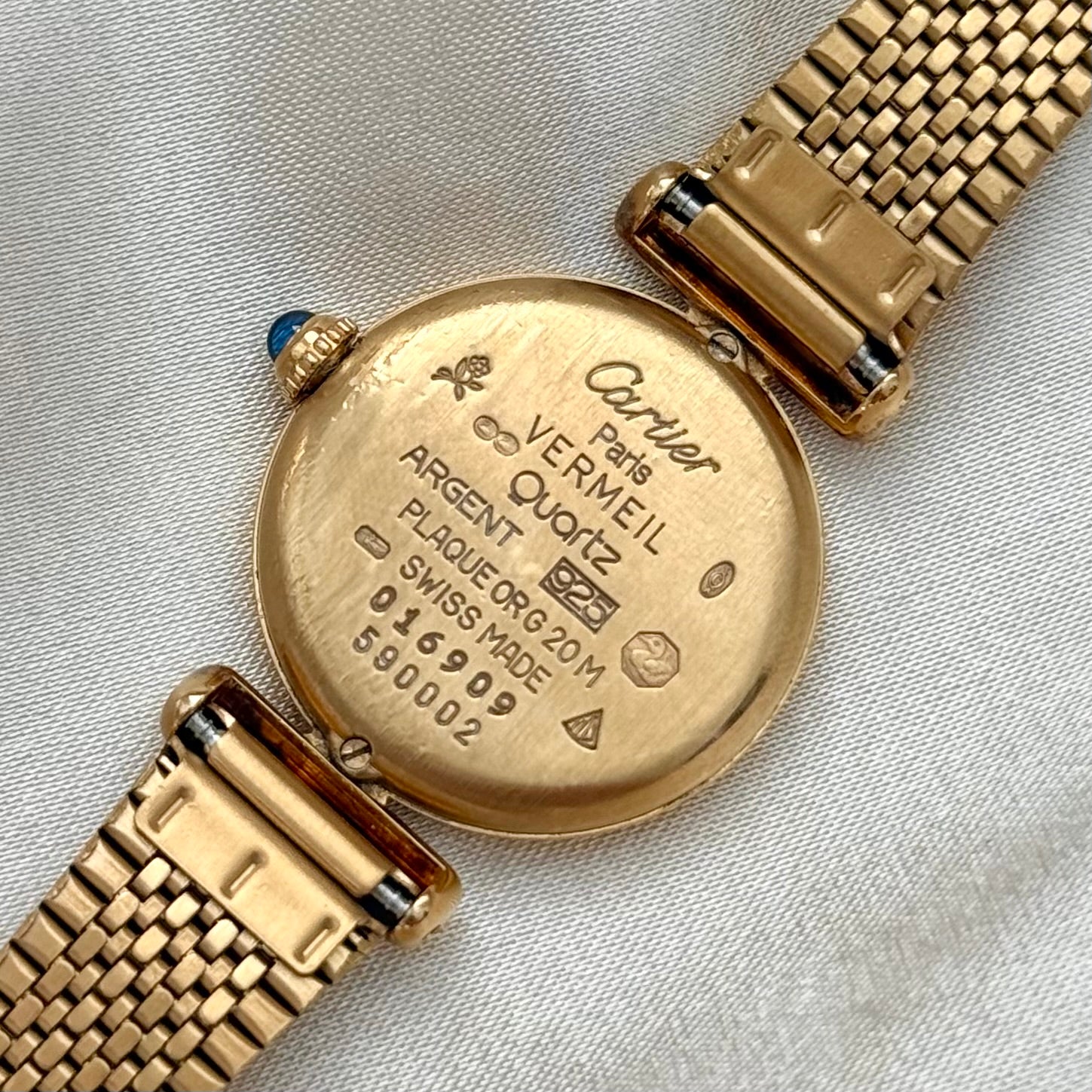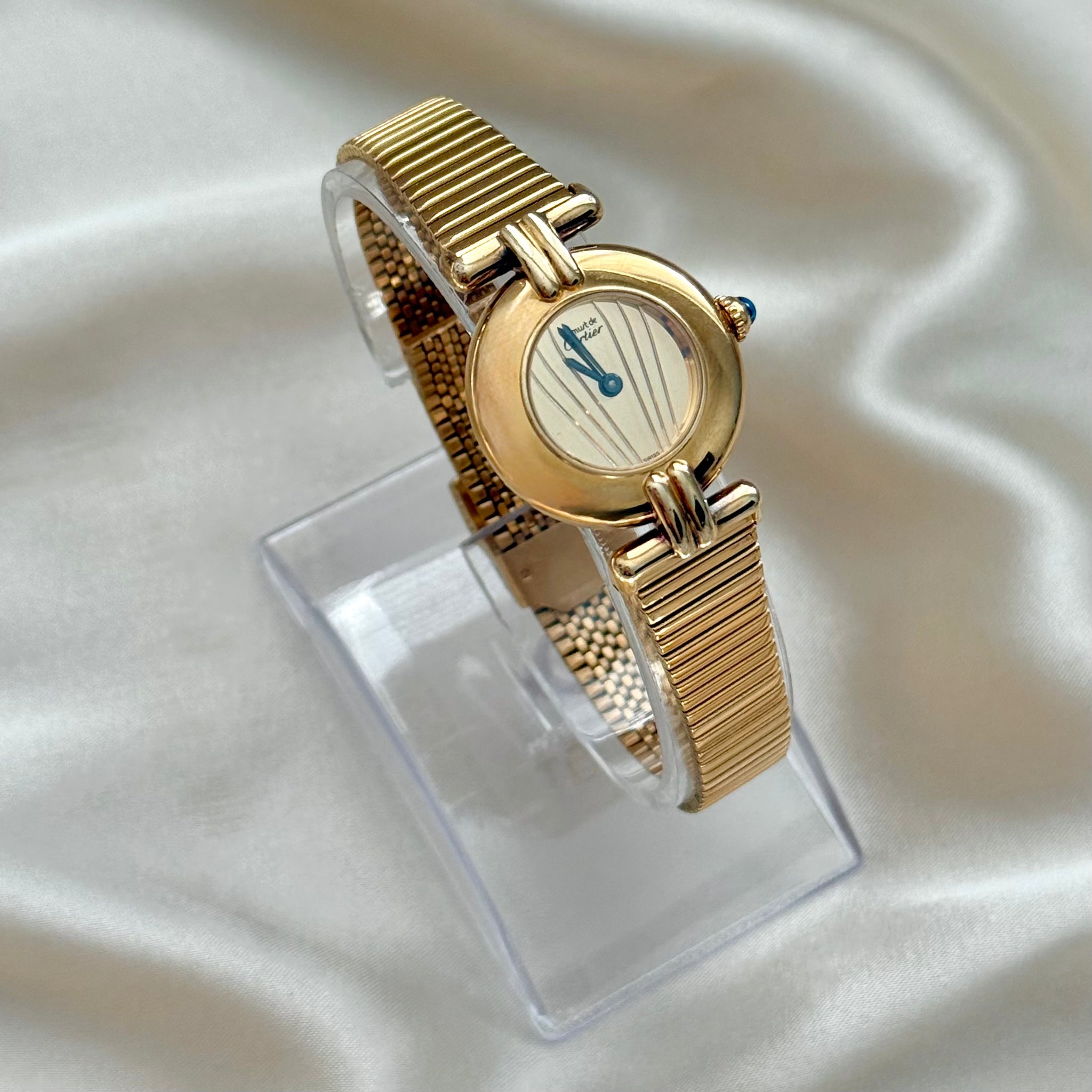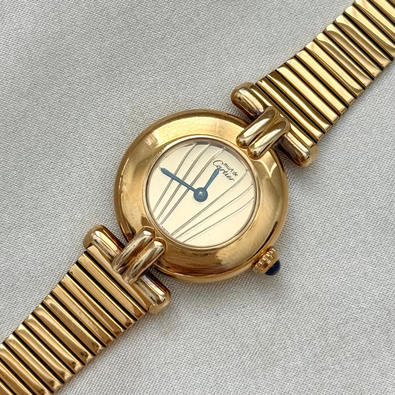 Elegant vintage Must de Cartier watch featuring a gold vermeil case and a champagne shell dial, paired with a gold-plated aftermarket strap for a refined, timeless look. Includes its original Cartier box.