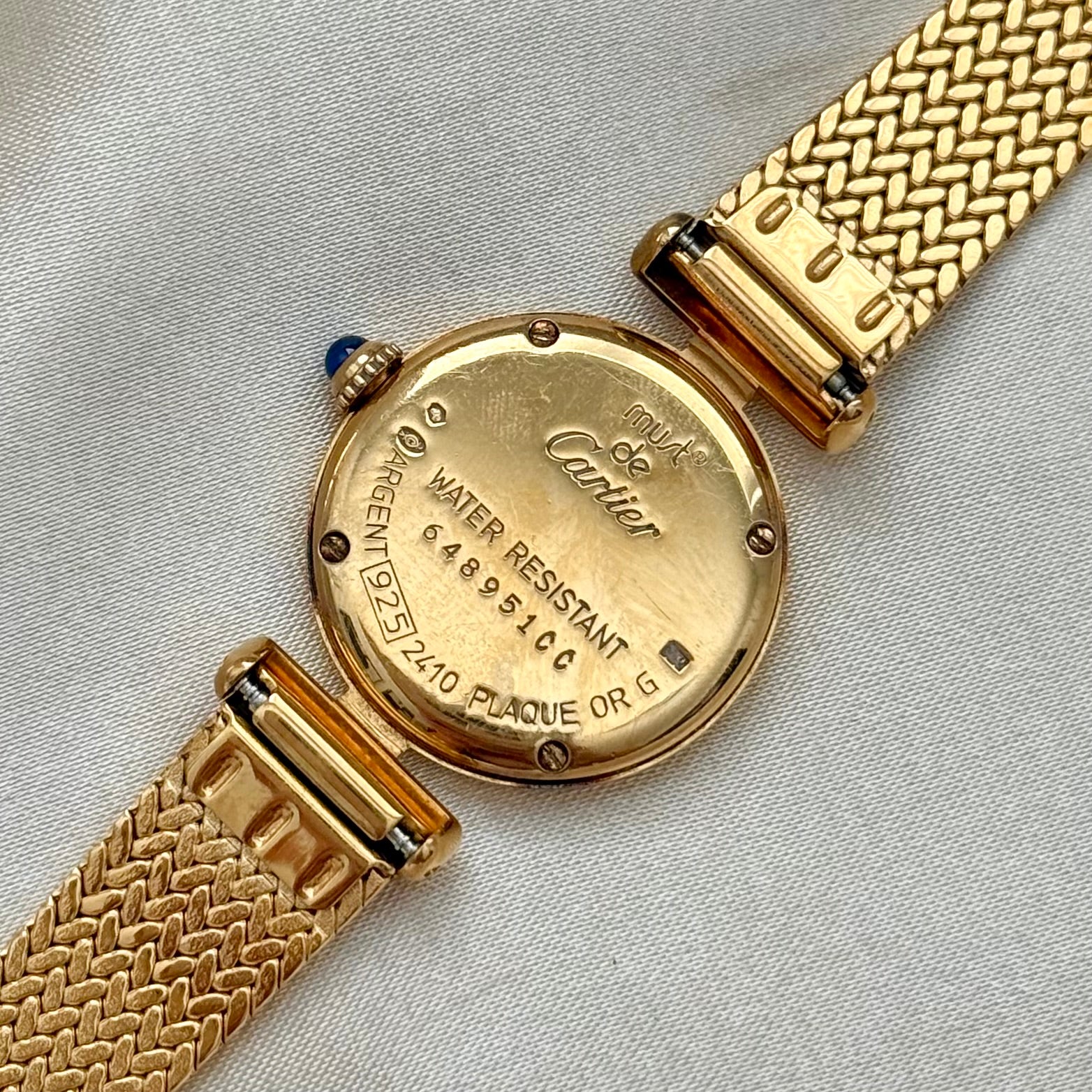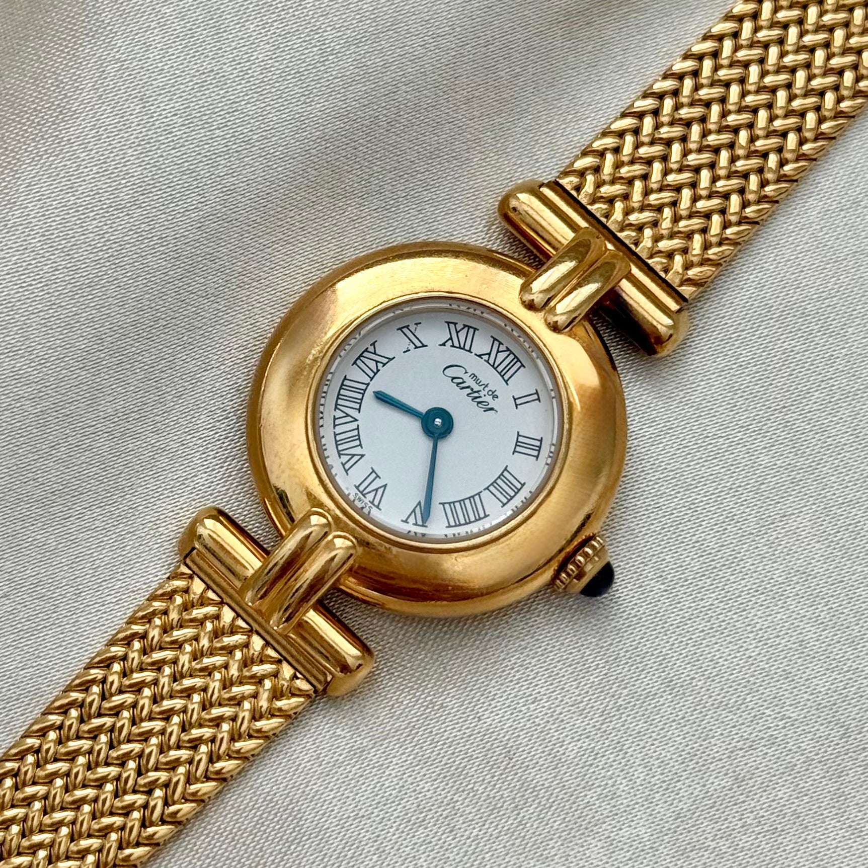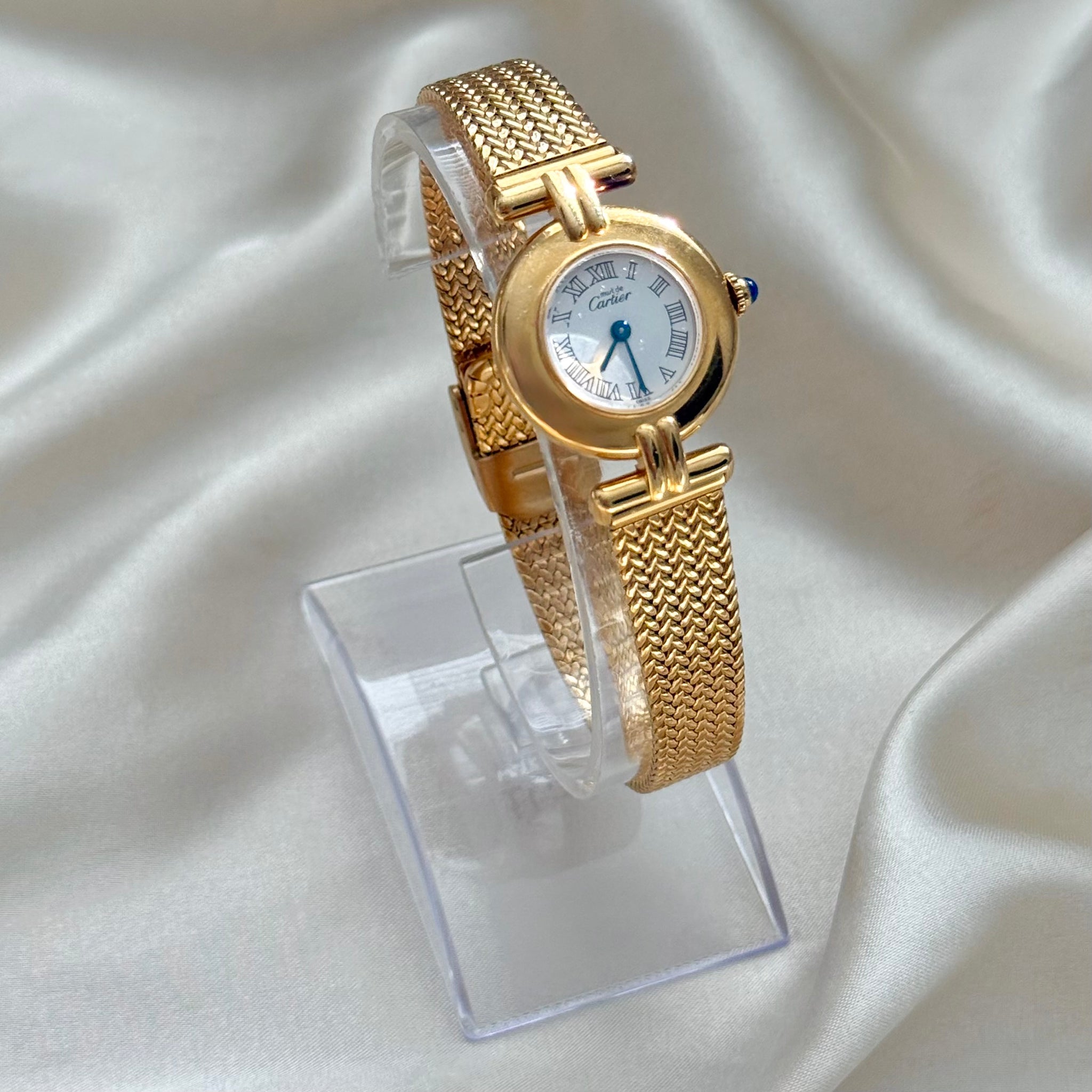 Elegant vintage Must de Cartier watch featuring a gold vermeil case and a classic white dial, paired with a gold-plated aftermarket strap for a refined, timeless look. Includes its original Cartier box.