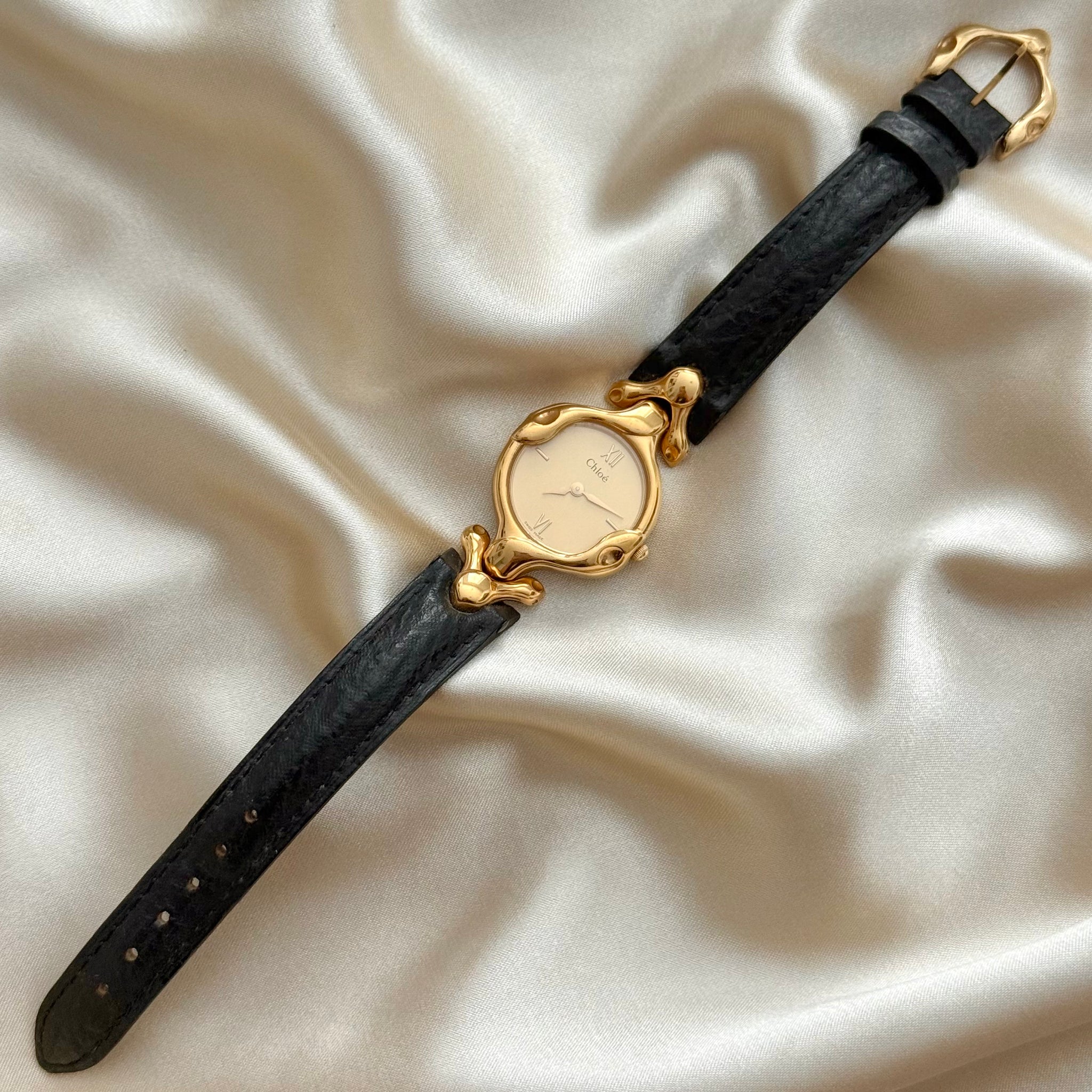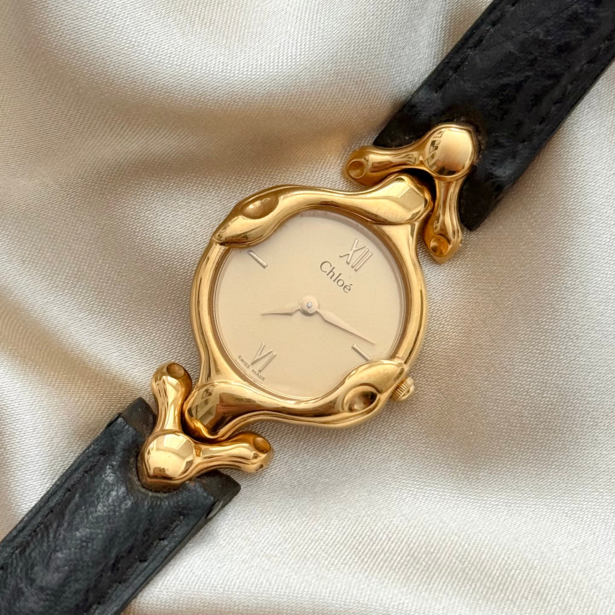Stunning and exceptionally rare vintage yellow gold-plated Chloé Art Nouveau watch, featuring a unique bezel design, vibrant black leather straps, and a clean gold dial for a bold yet elegant statement.