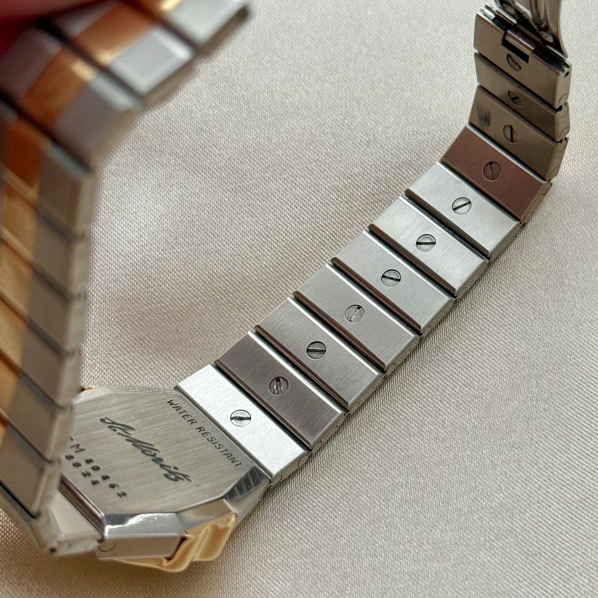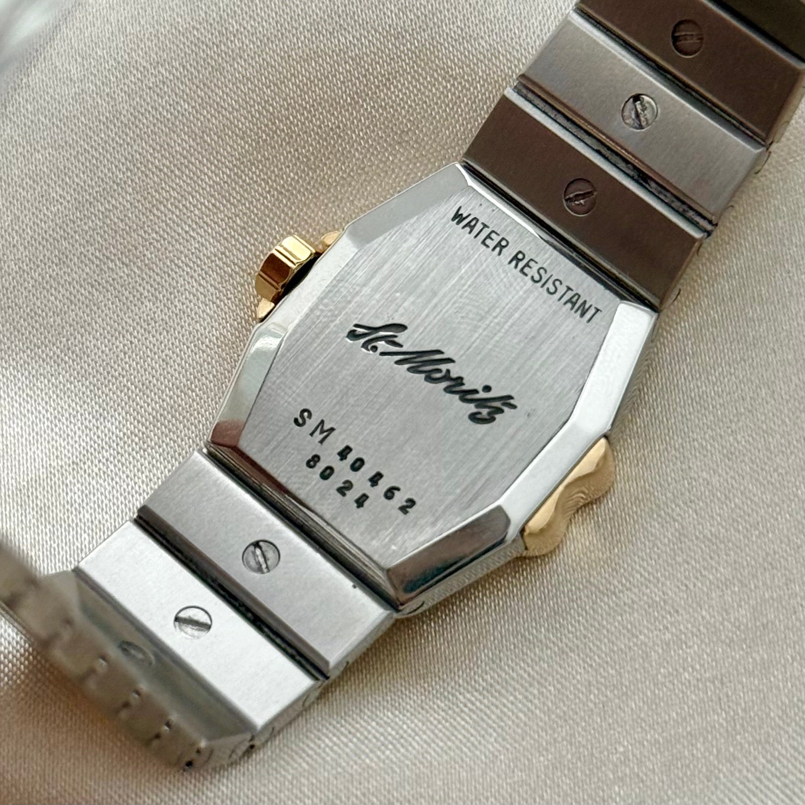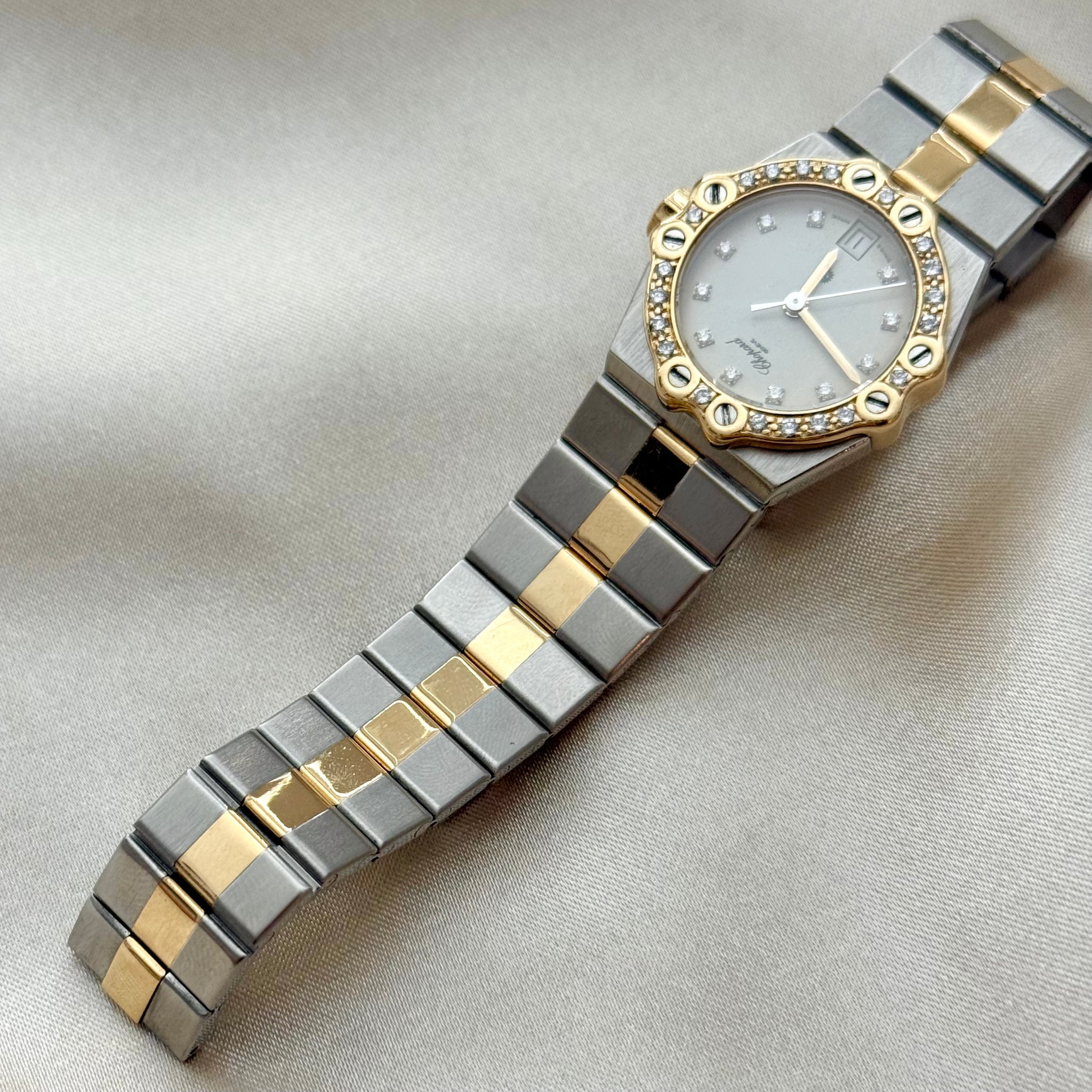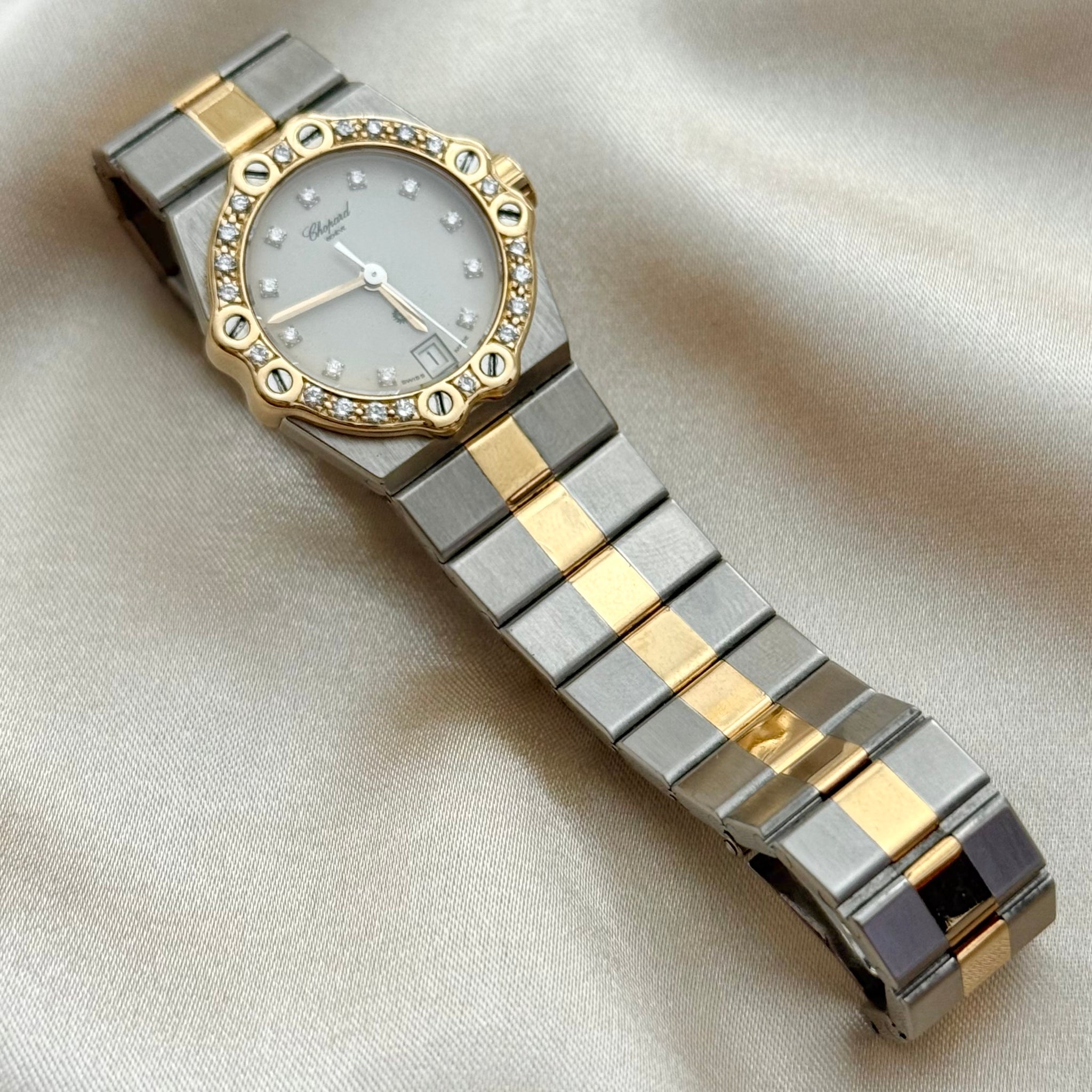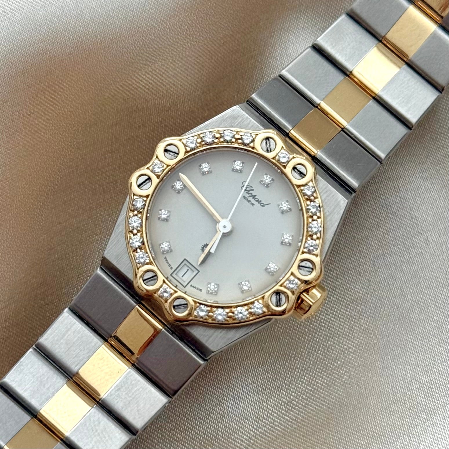 Rare 2000s Chopard St. Moritz 8024 ladies watch, exquisitely crafted in 18K solid yellow gold and stainless steel. This timepiece features an original dial with 11 real diamond hour markers, a sparkling real diamond bezel, and a convenient quickset date function.