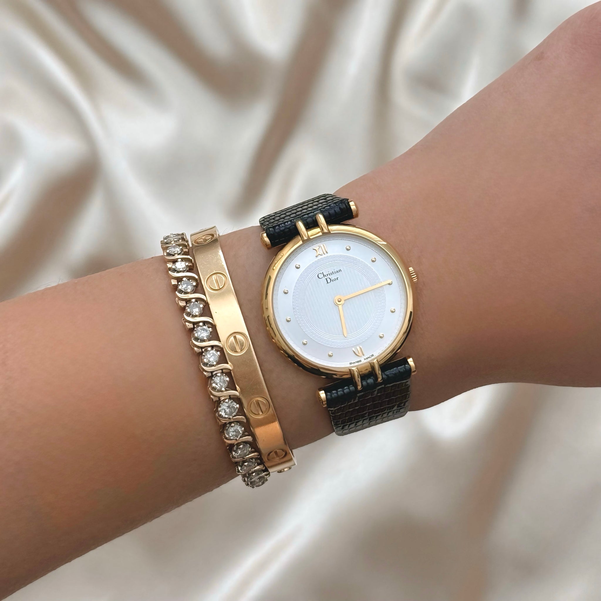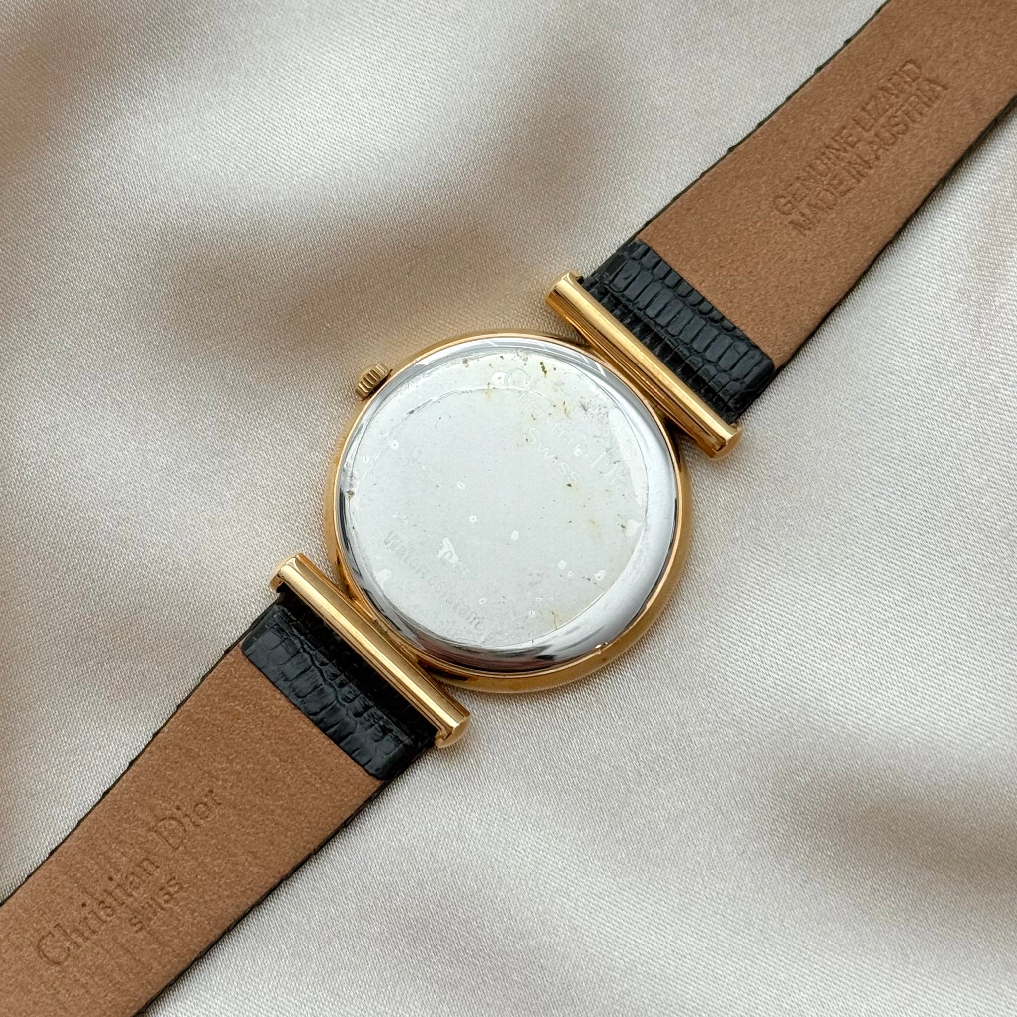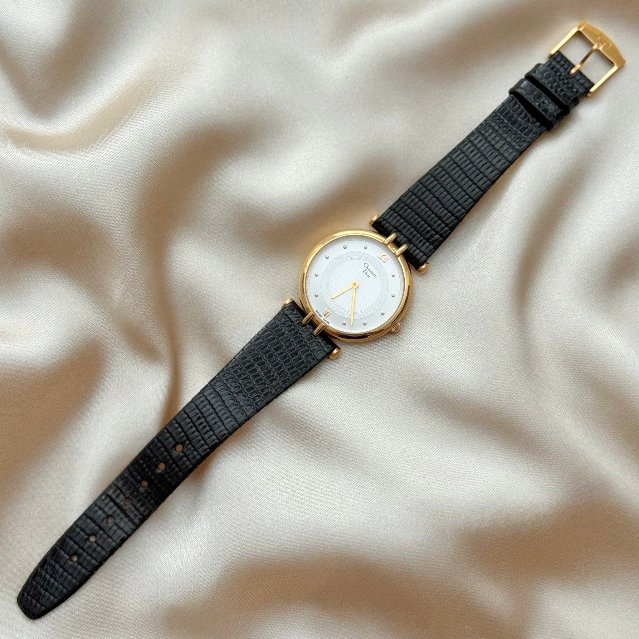 Gorgeous and rare vintage Christian Dior watch, featuring a classic round white dial framed in gold plating and paired with a genuine black leather strap.