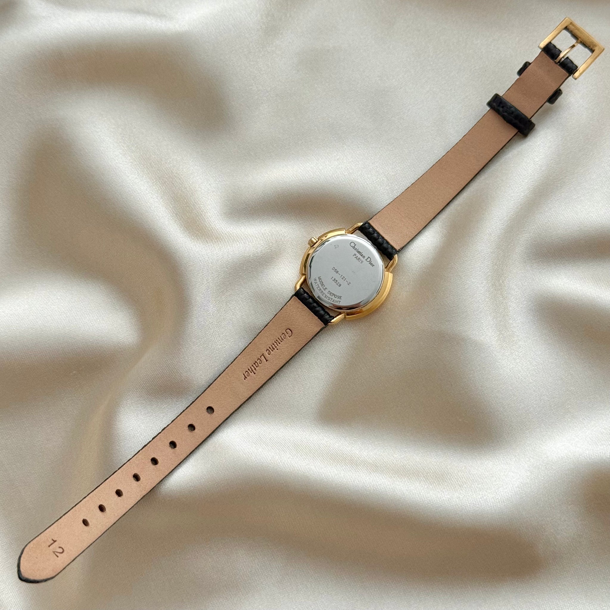 Gorgeous and rare vintage Christian Dior watch, showcasing a uniquely shaped case with a classic white dial set in a gold-plated frame, paired with a black genuine leather strap.