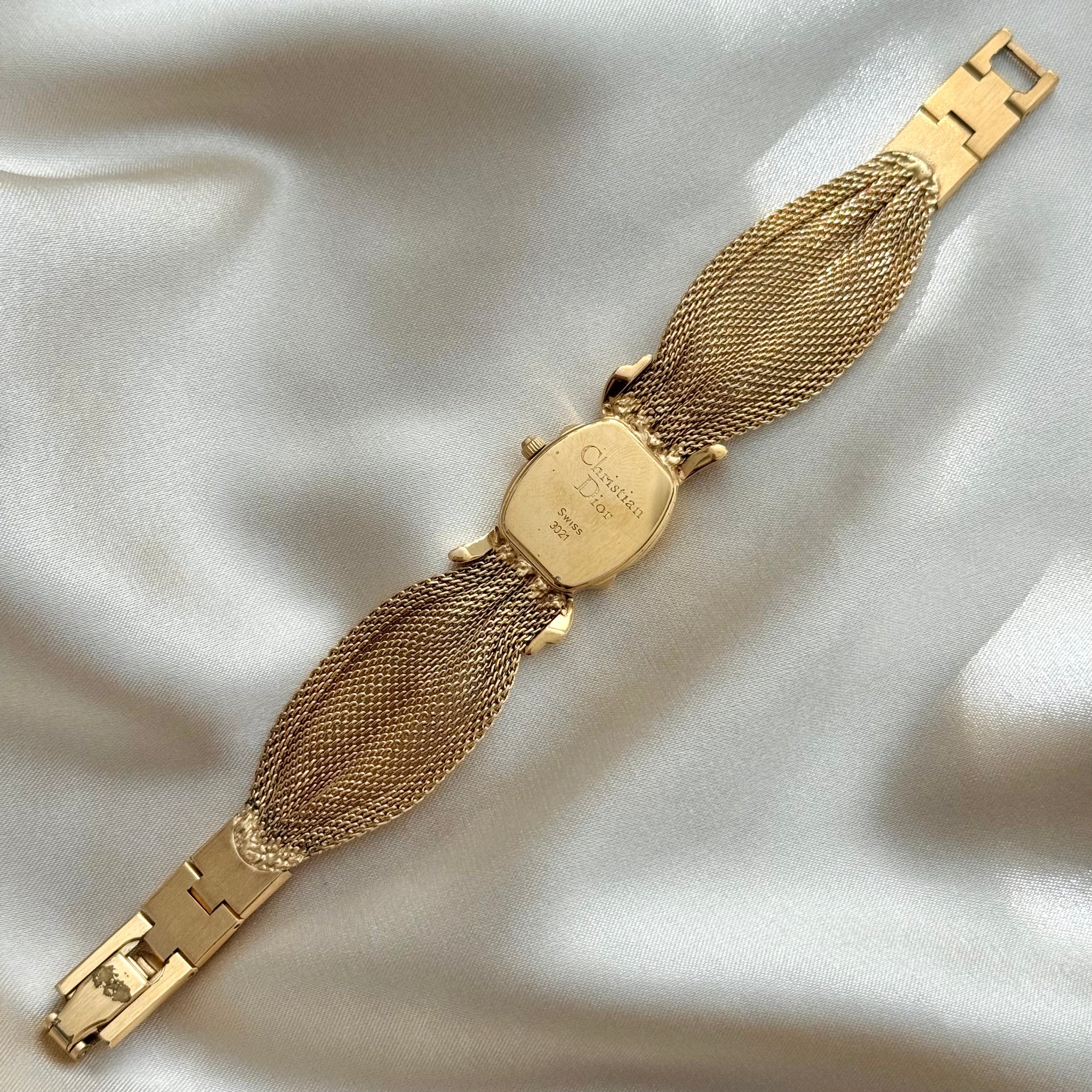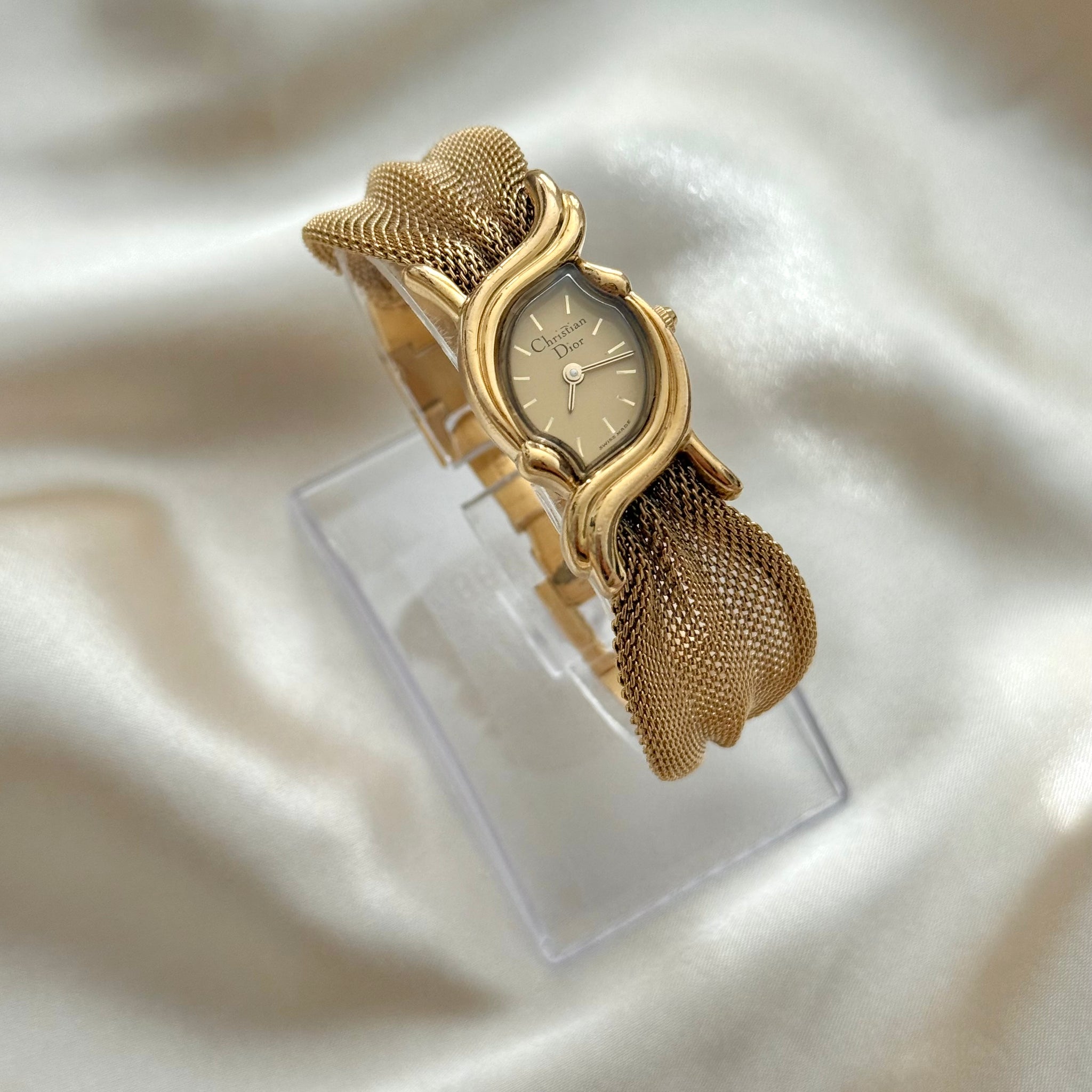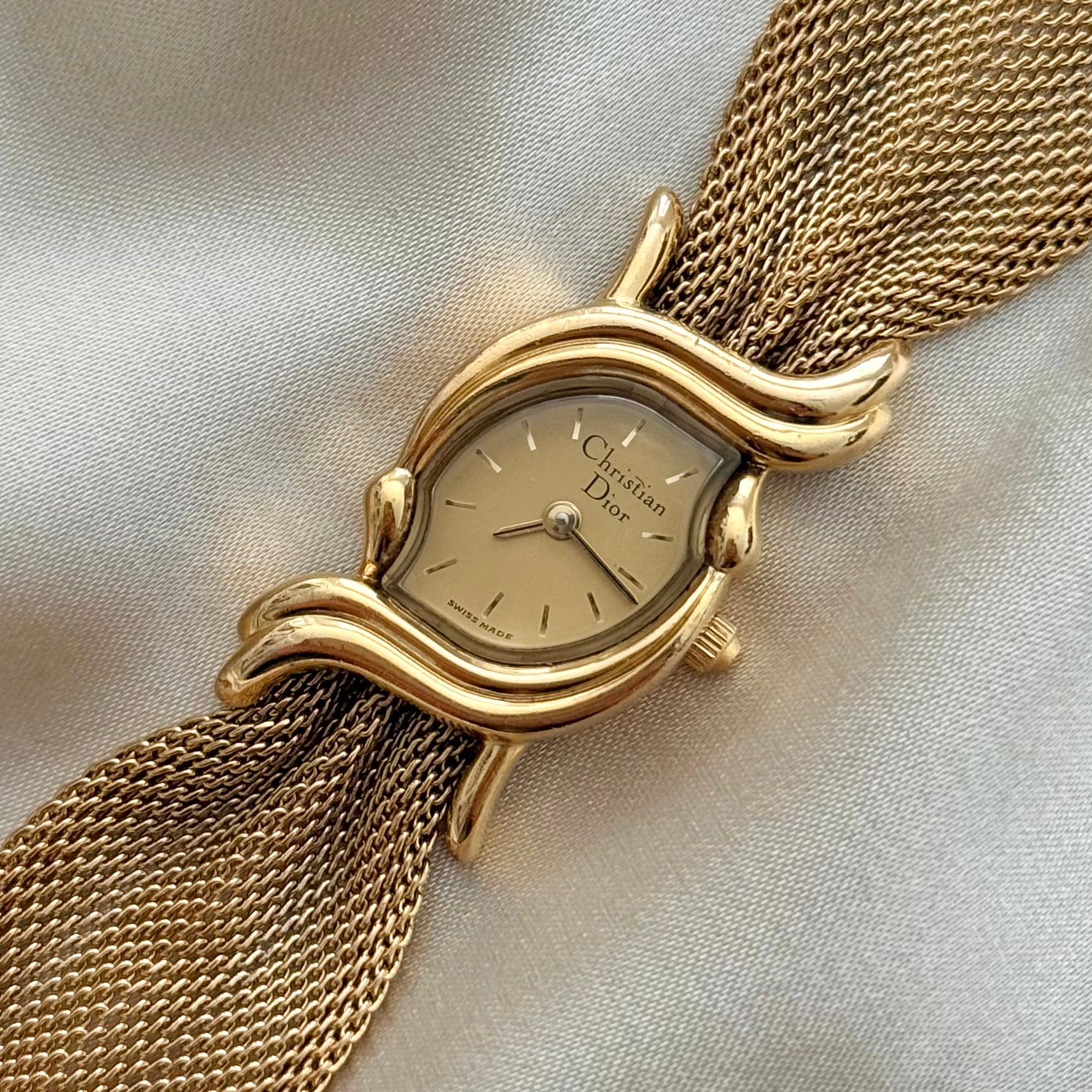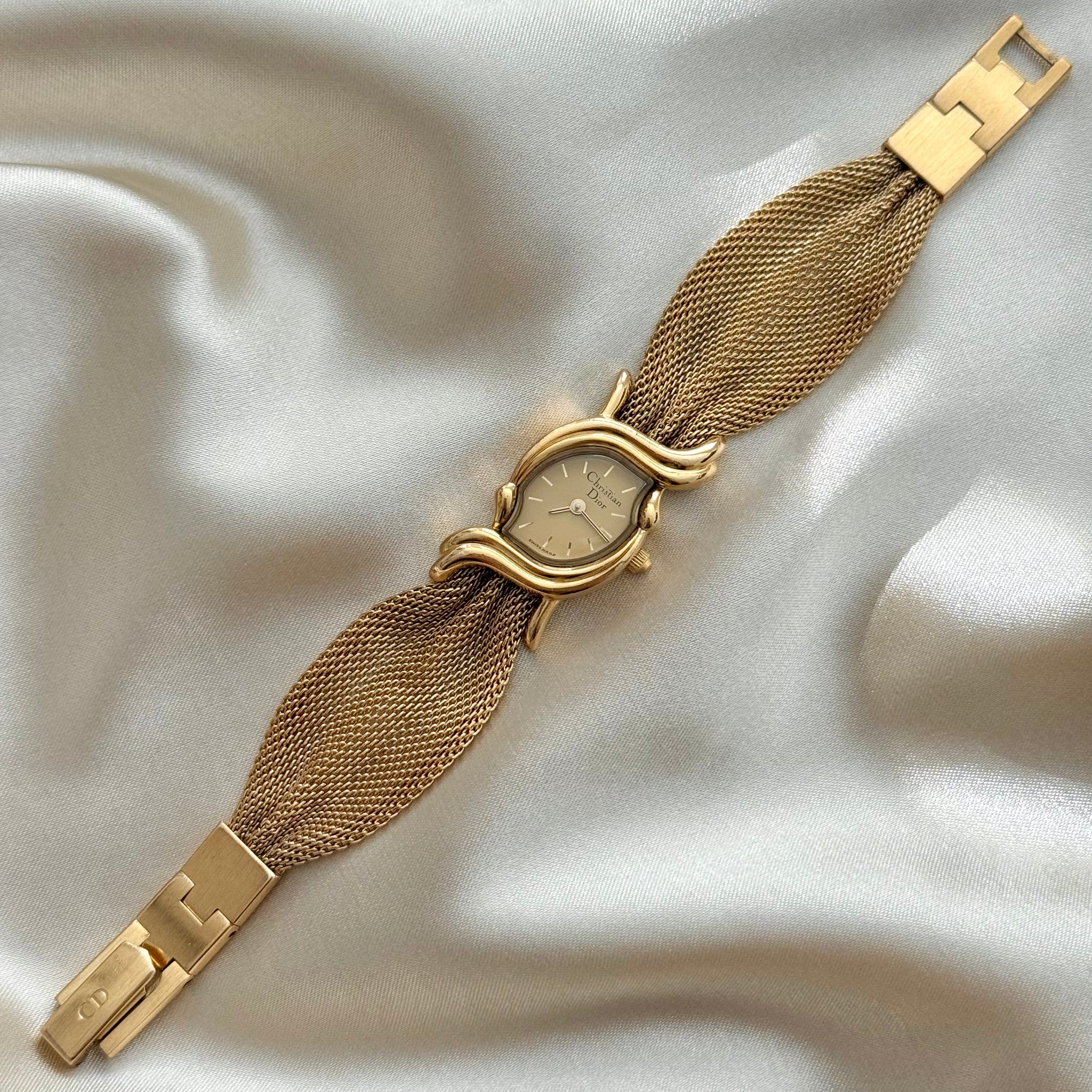 Stunning and exceptionally rare vintage Christian Dior watch showcasing a uniquely curved gold-plated case, distinctive gold-tone bracelet, and matching gold dial.