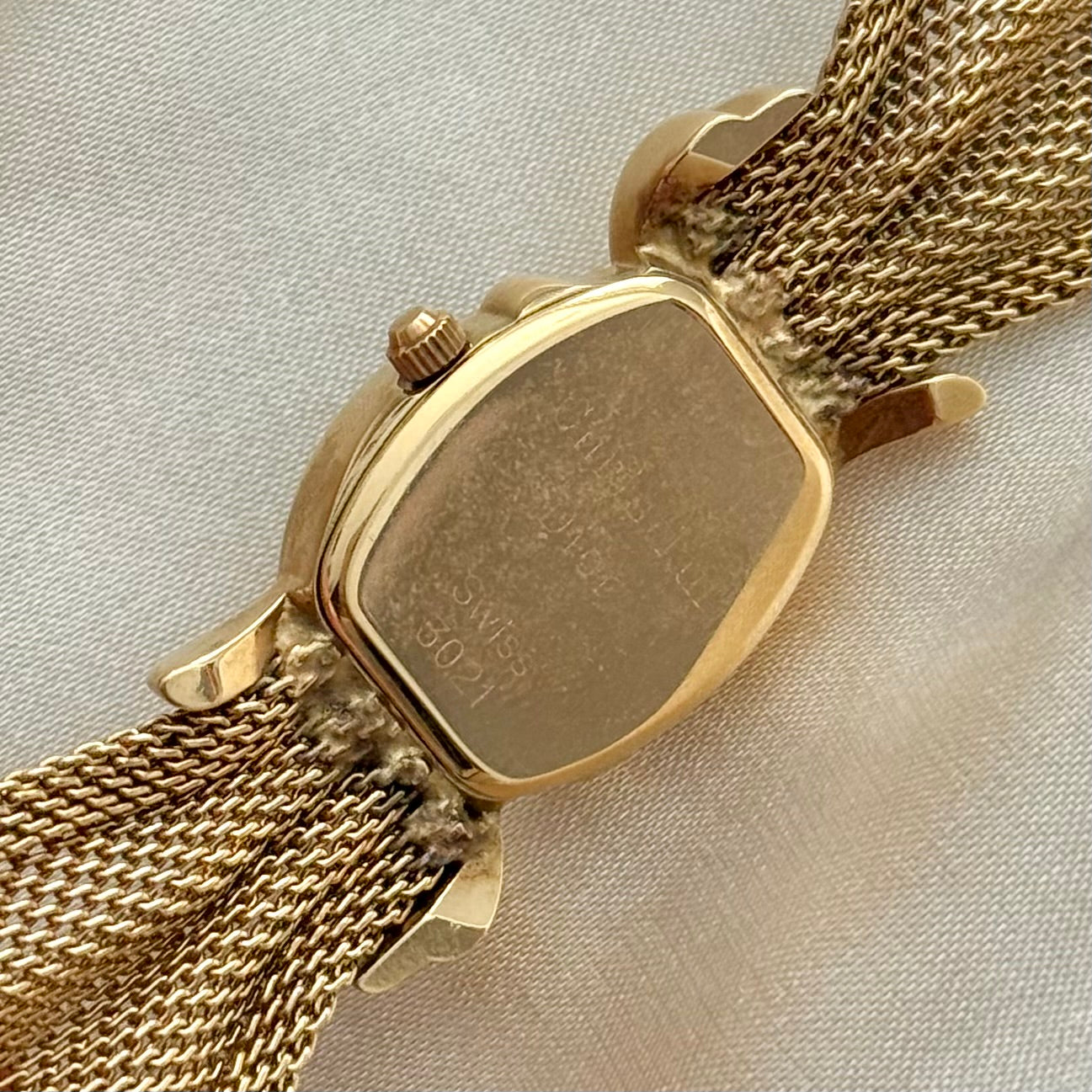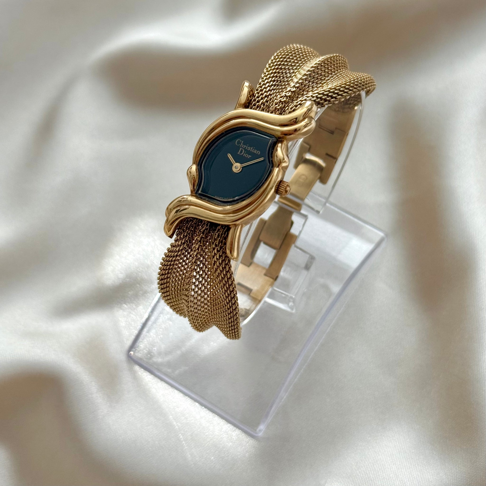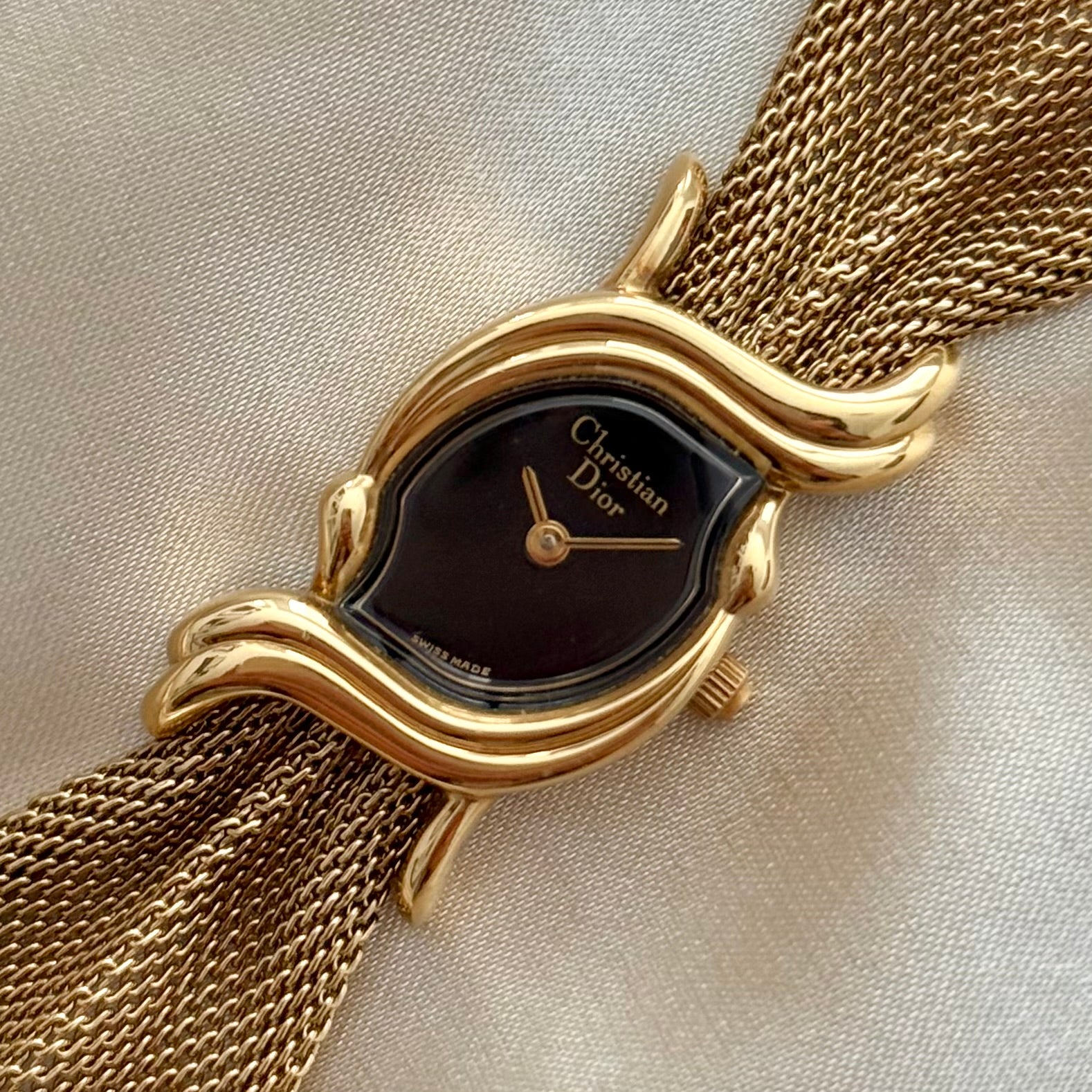 Stunning and exceptionally rare vintage Christian Dior watch showcasing a uniquely curved gold-plated case, distinctive gold-tone bracelet, and matching black dial.