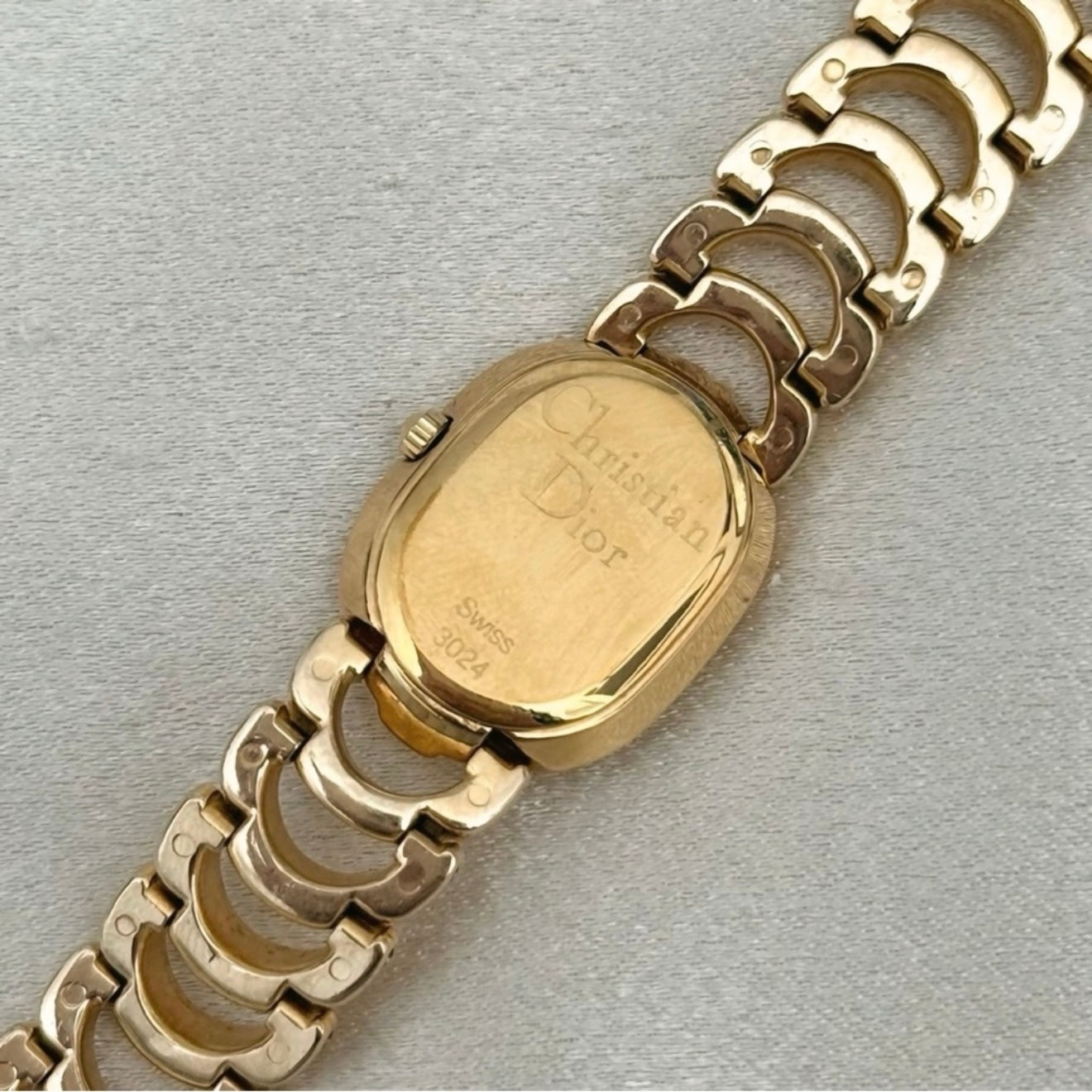 Elegant and rare vintage Christian Dior watch featuring an oval-shaped gold-plated case, matching gold-tone bracelet, and a refined gold dial.
