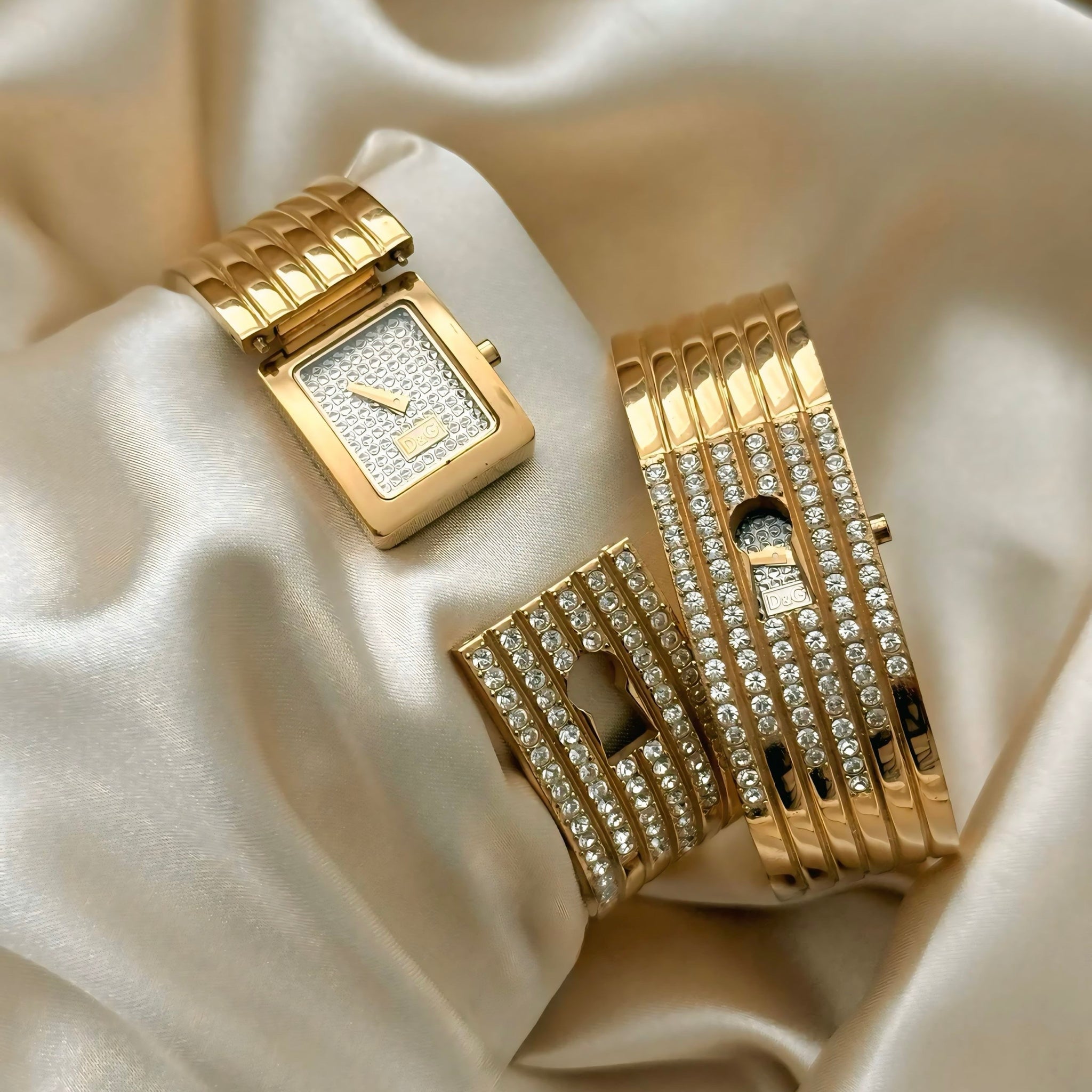 Gorgeous and rare vintage yellow gold-plated Dolce & Gabbana watch with a beautiful bracelet and rhinestone hidden dial. Bracelet clasp closure.