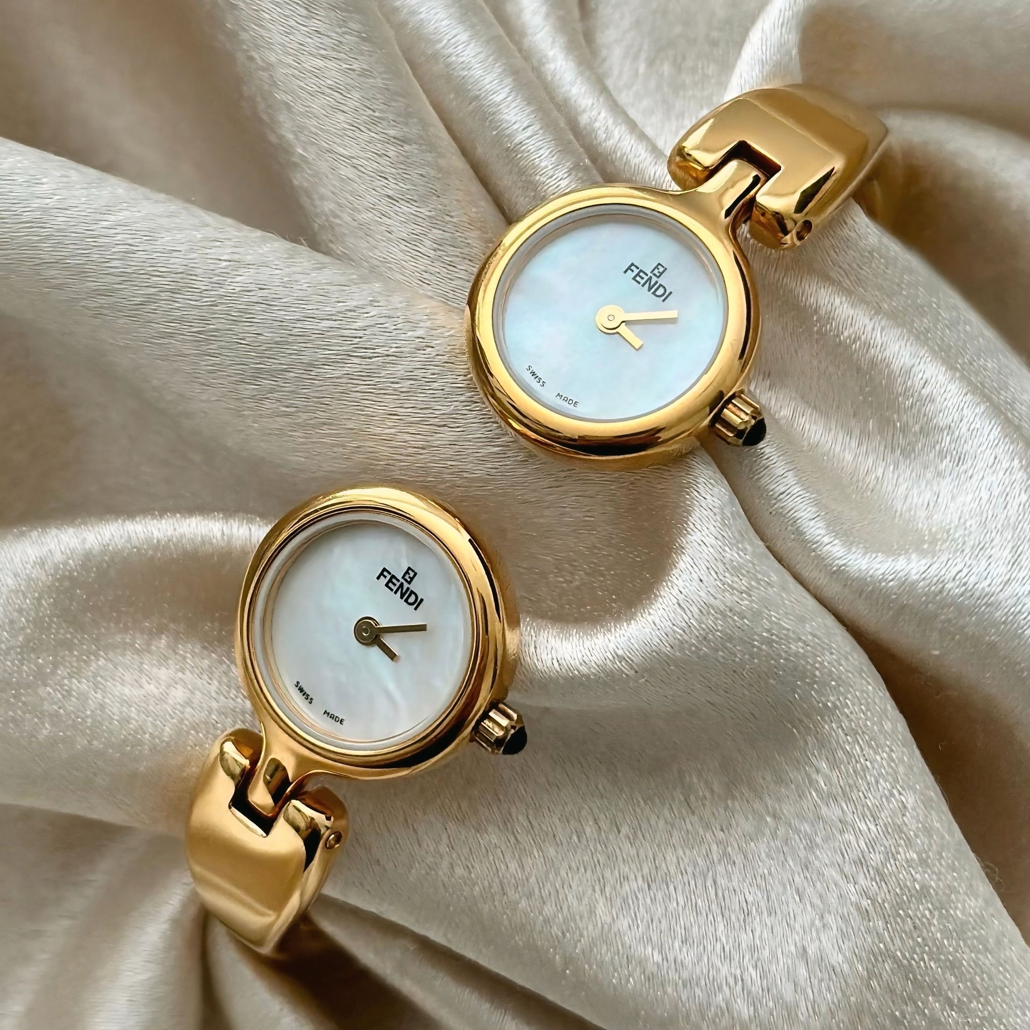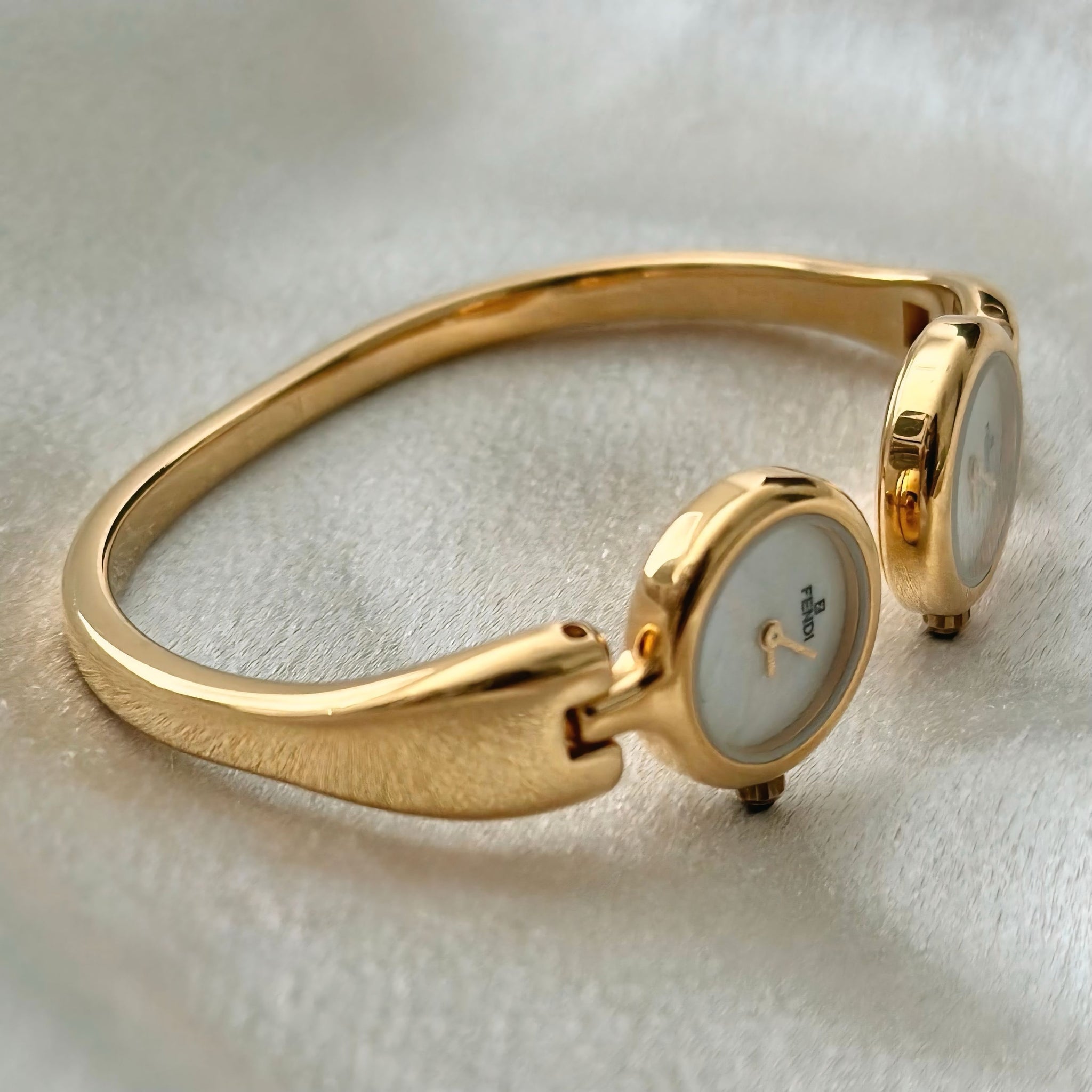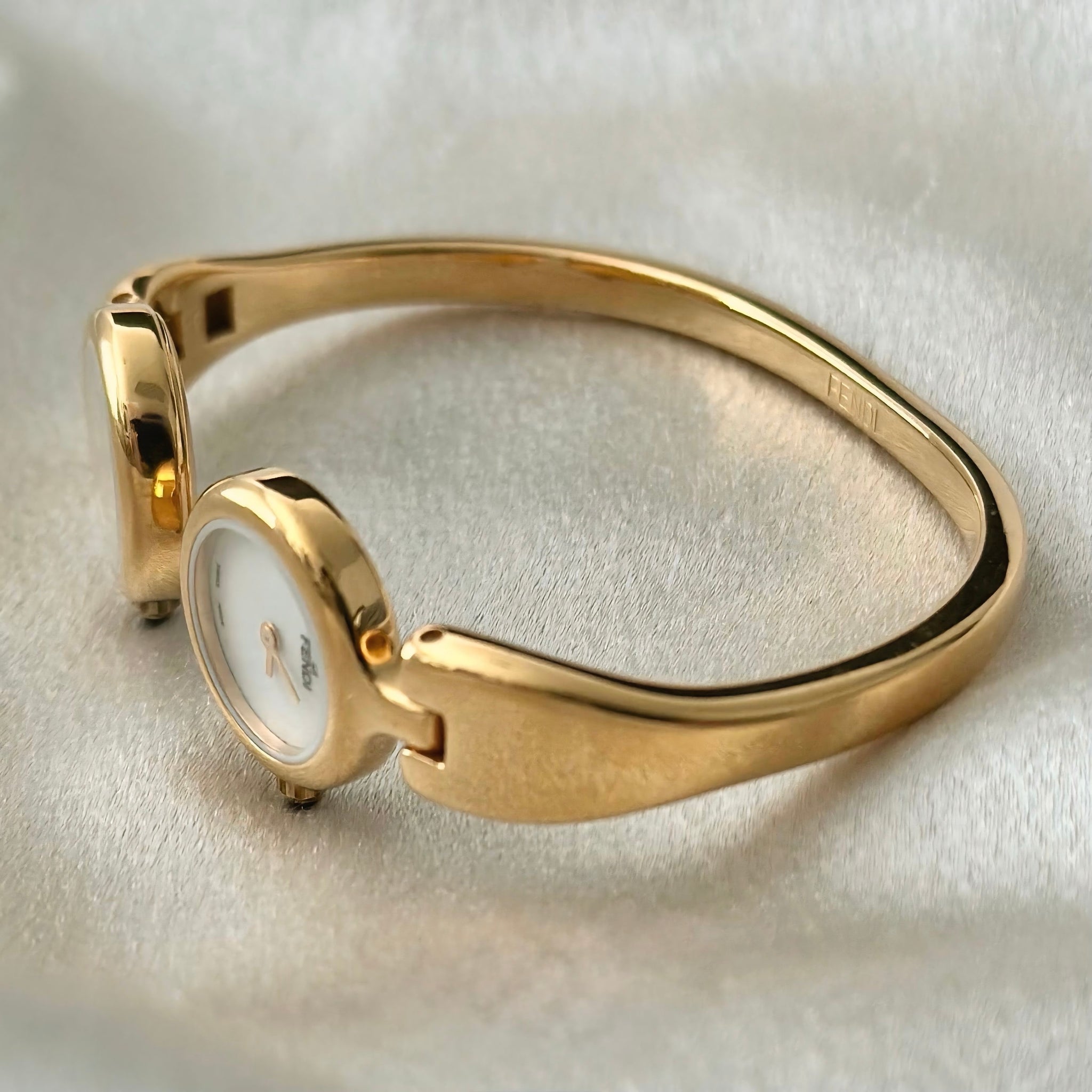 An extraordinary vintage Fendi cuff watch, featuring exceptional rarity and elegant 18k gold plating. Equipped with the original movement and a newly installed battery, it is fully functional.