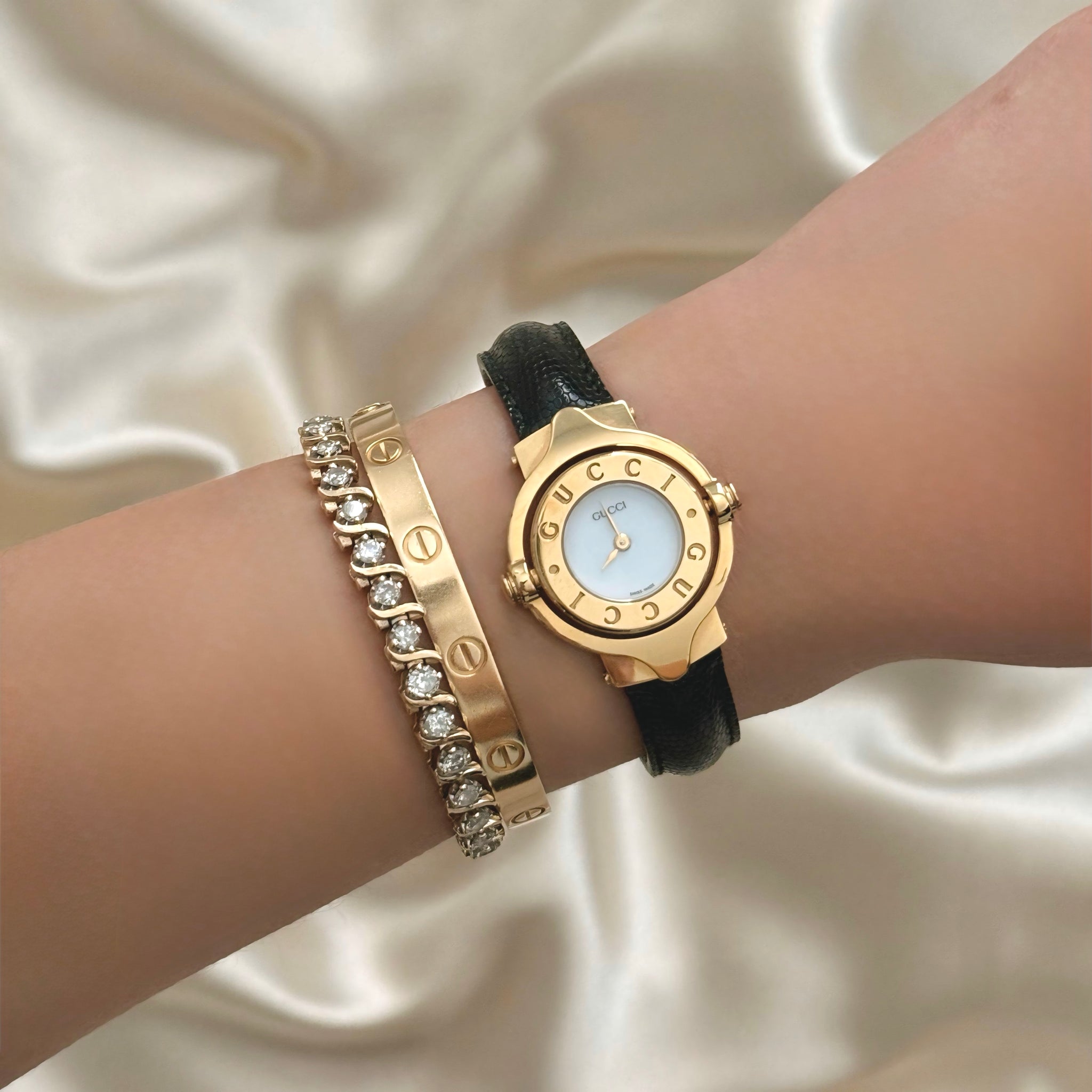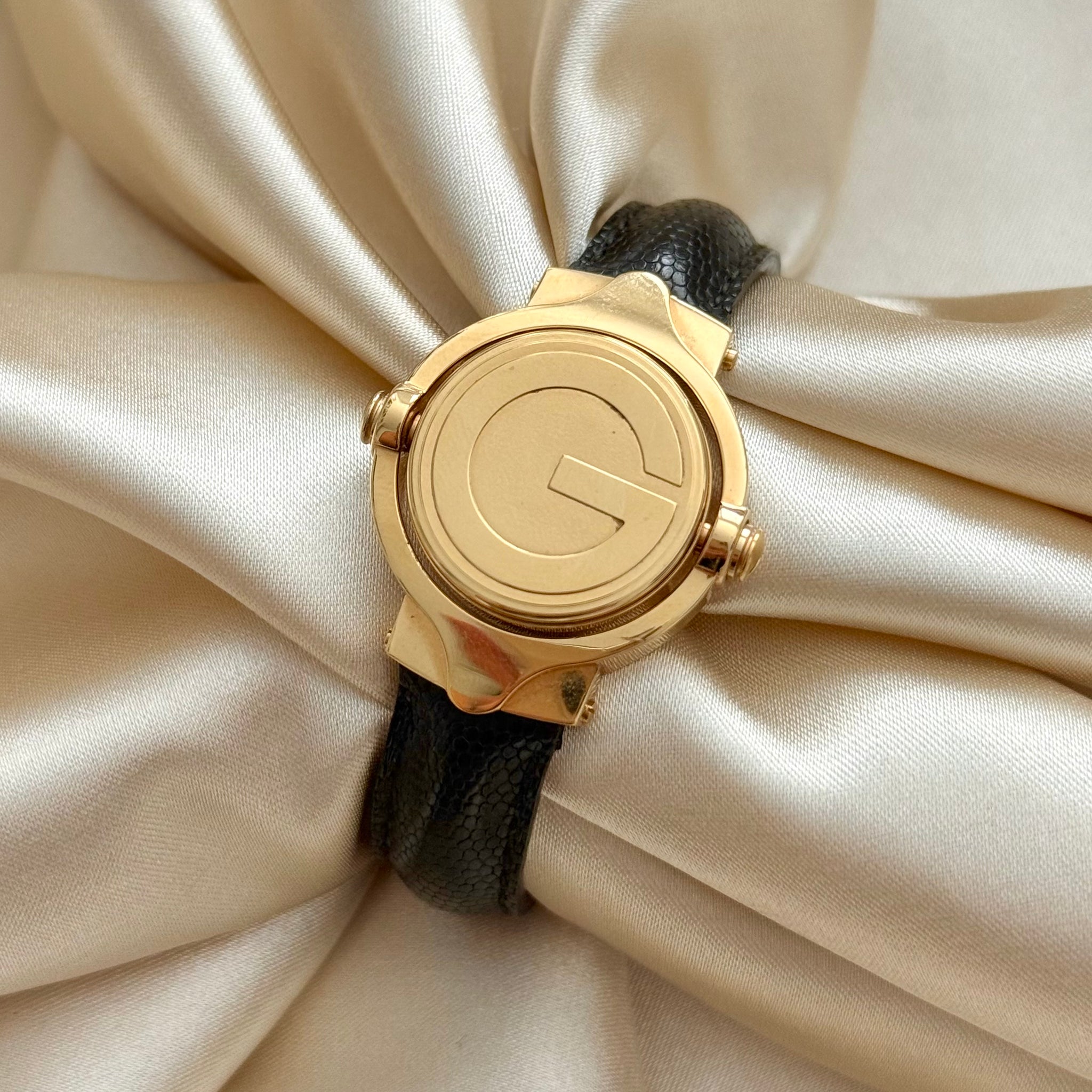 Rare and exceptional vintage gold-plated Swiss quartz Gucci watch, showcasing a round case, signature white dial, and black genuine leather cuff-style bracelet. Features a hidden, rotatable Reverso-style dial with a “G” initial for Gucci on the reverse side.