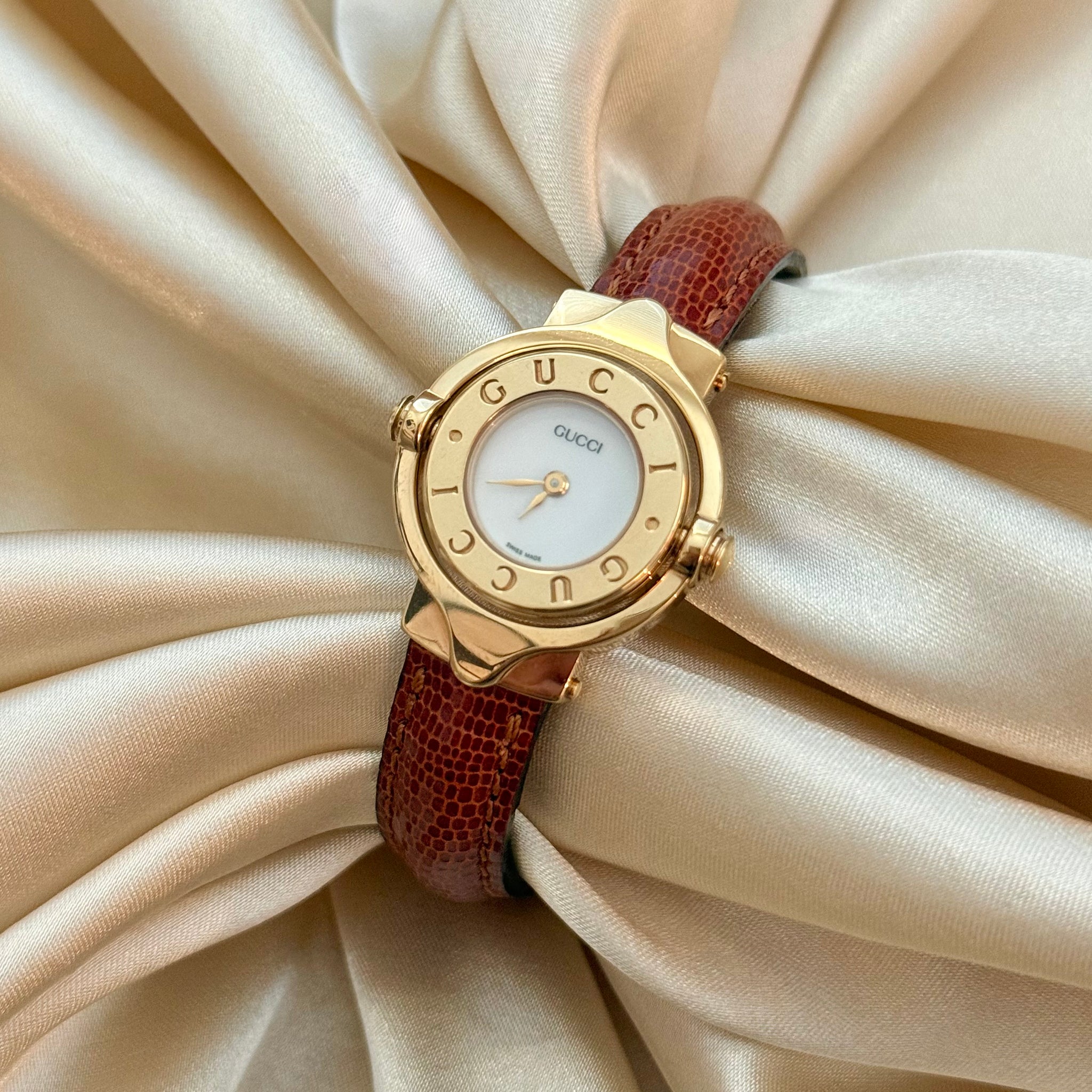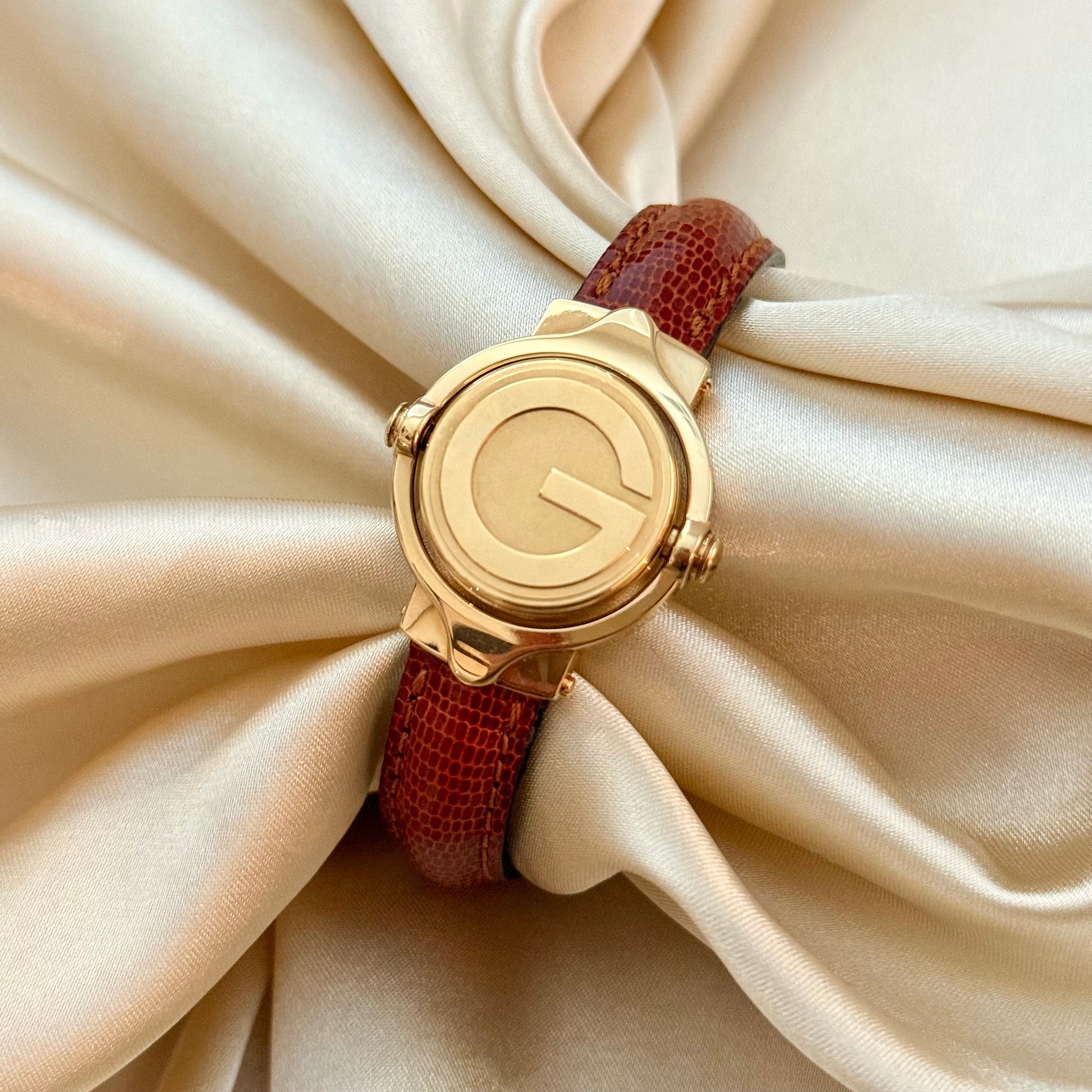 Rare and exceptional vintage gold-plated Swiss quartz Gucci watch, showcasing a round case, signature white dial, and brown genuine leather cuff-style bracelet. Features a hidden, rotatable Reverso-style dial with a “G” initial for Gucci on the reverse side.