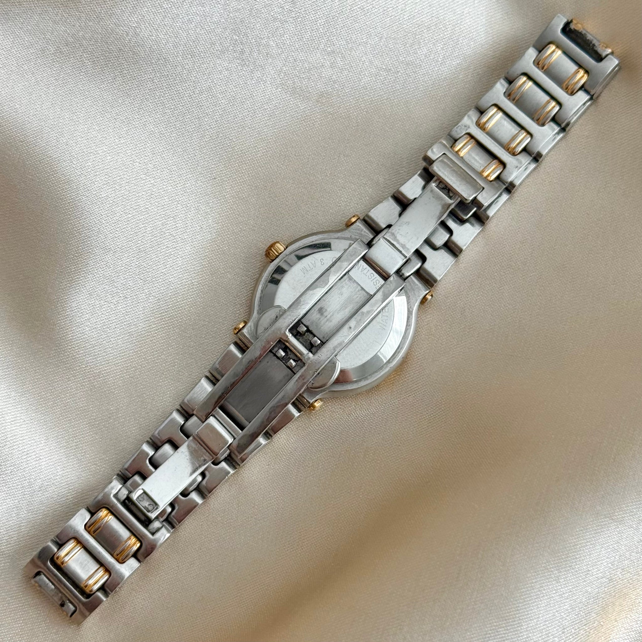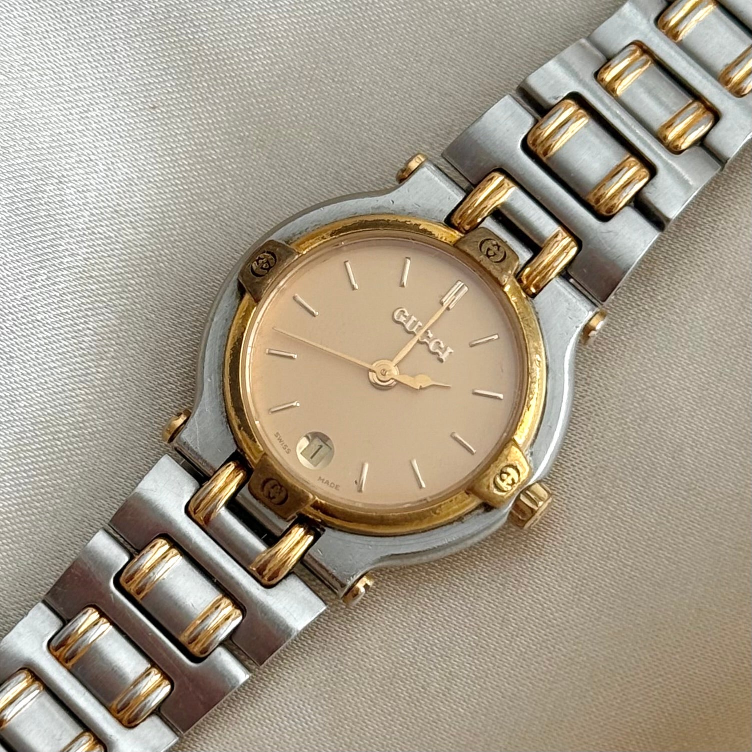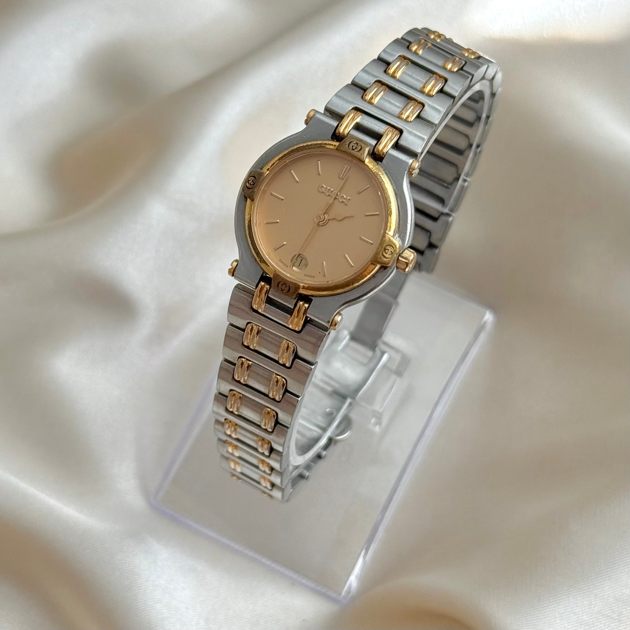 Stunning and rare vintage Gucci watch in yellow gold-plated and stainless steel, featuring a striking two-tone bracelet and an elegant white and gold dial. Secured with a bracelet clasp closure.