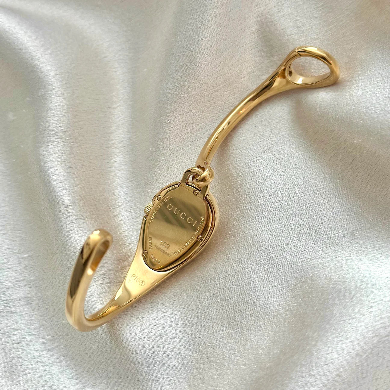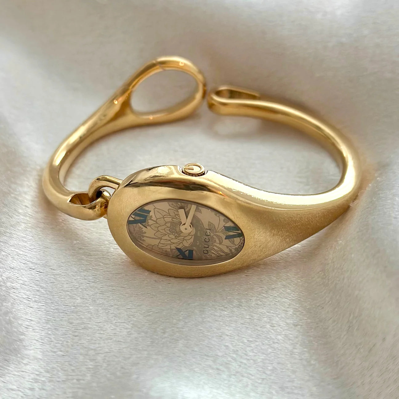 Stunning and rare vintage yellow gold-plated Gucci watch featuring a uniquely shaped silhouette and a gold dial adorned with elegant floral engravings. Secures with a bracelet hook closure.