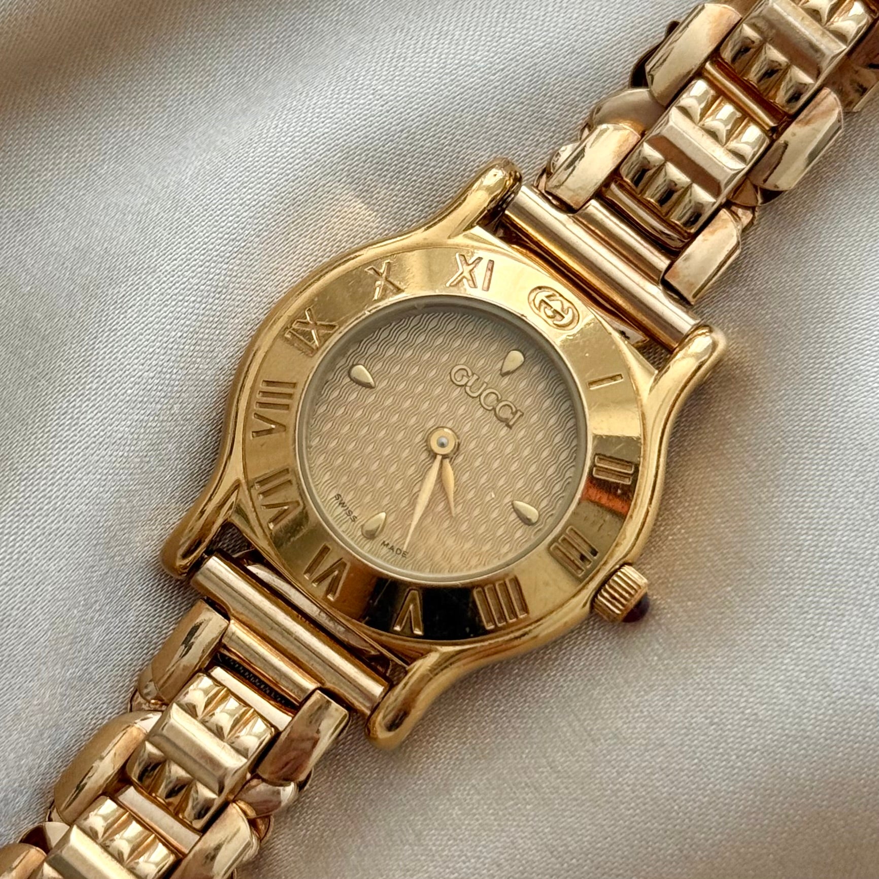 Incredible and rare vintage gold-plated Swiss quartz Gucci watch featuring a round case, elegant beige honeycomb dial, and a gold-plated stretchy band. The band fits a 7-inch wrist and stretches up to 7.75 inches.