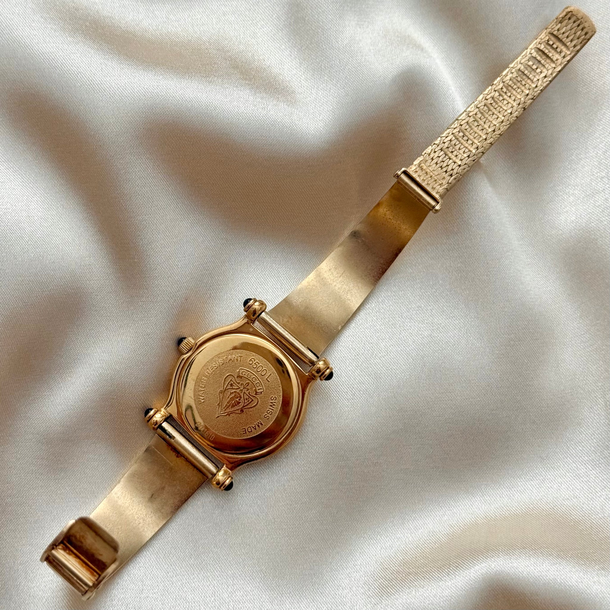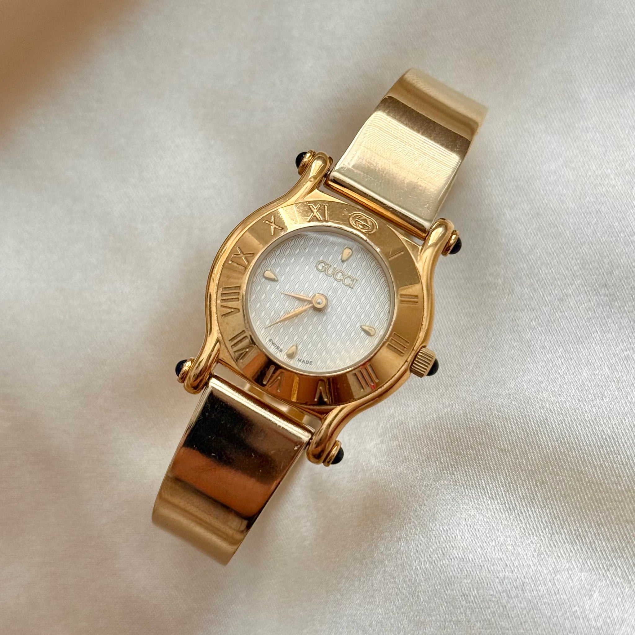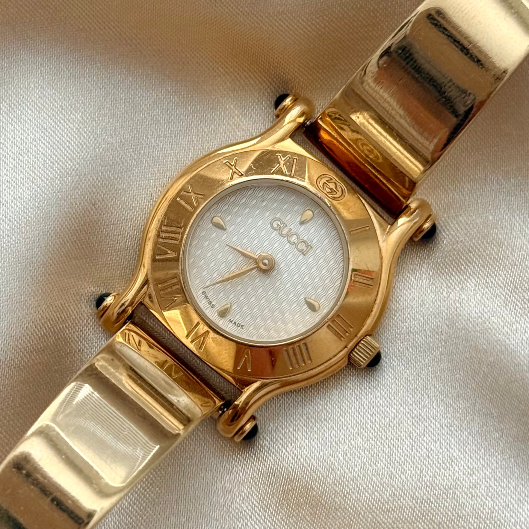 Incredible and rare vintage Gucci gold-plated Swiss quartz watch, featuring a round case, an elegant white honeycomb dial, and a gold-plated expandable slide bracelet.