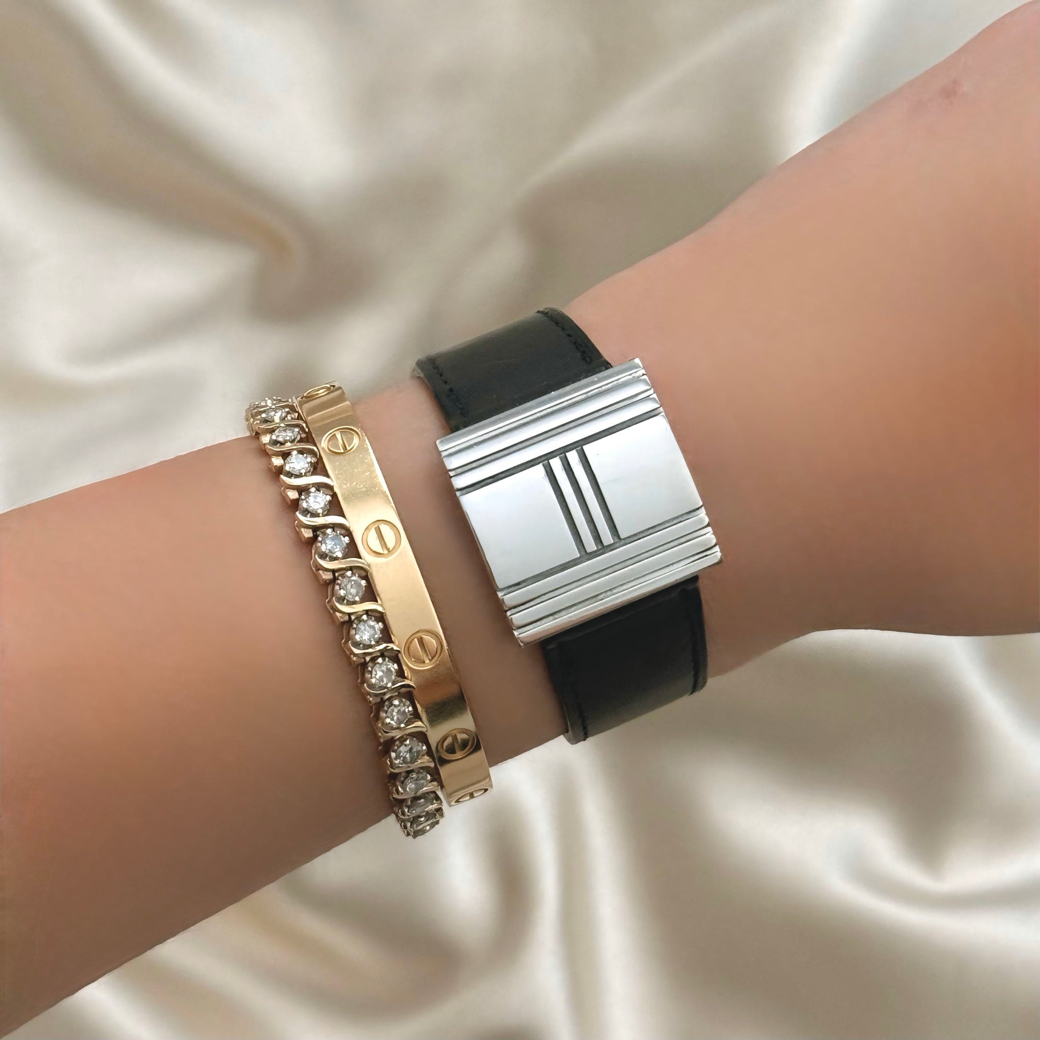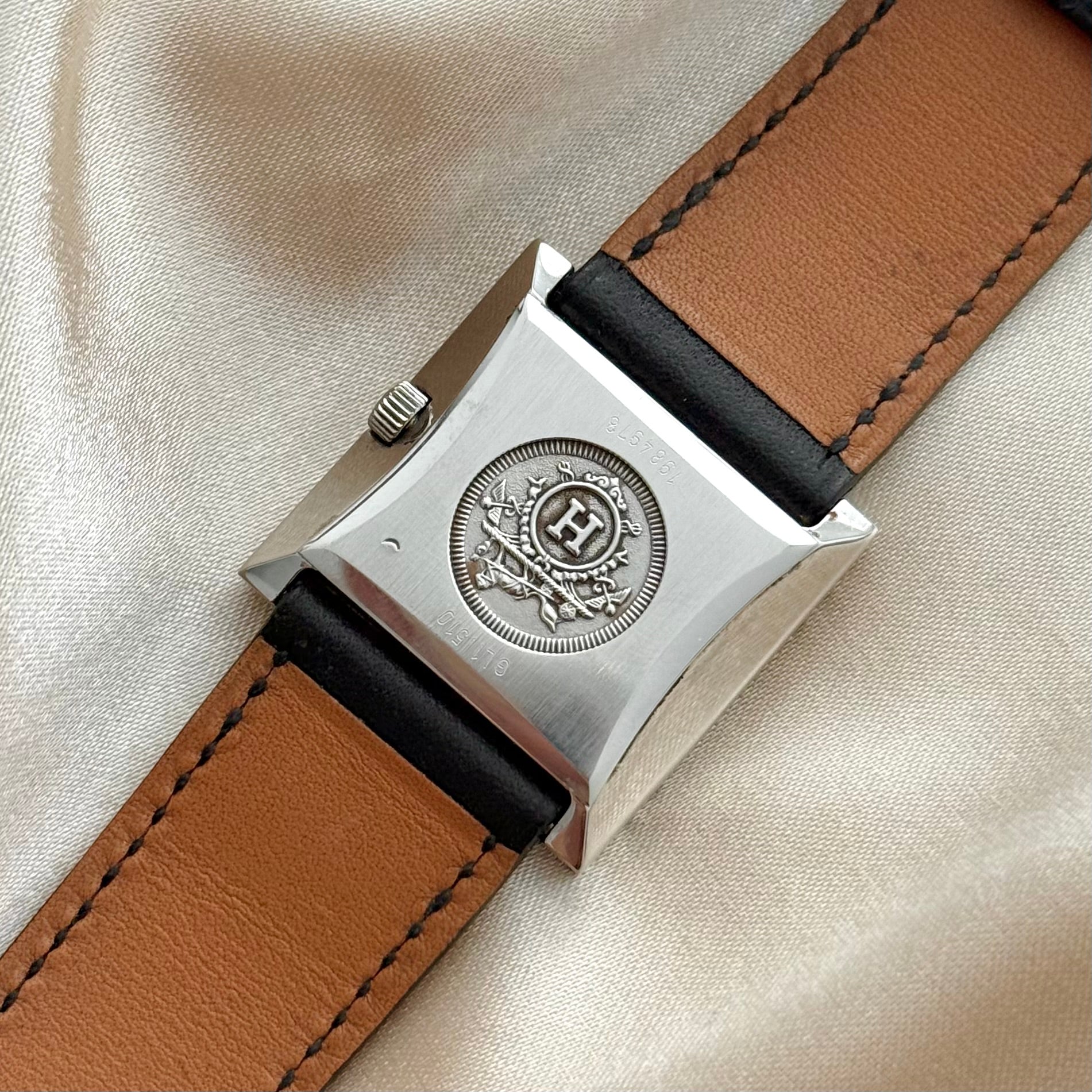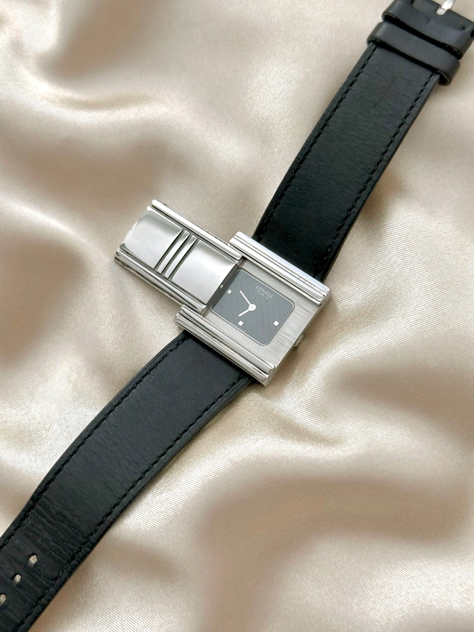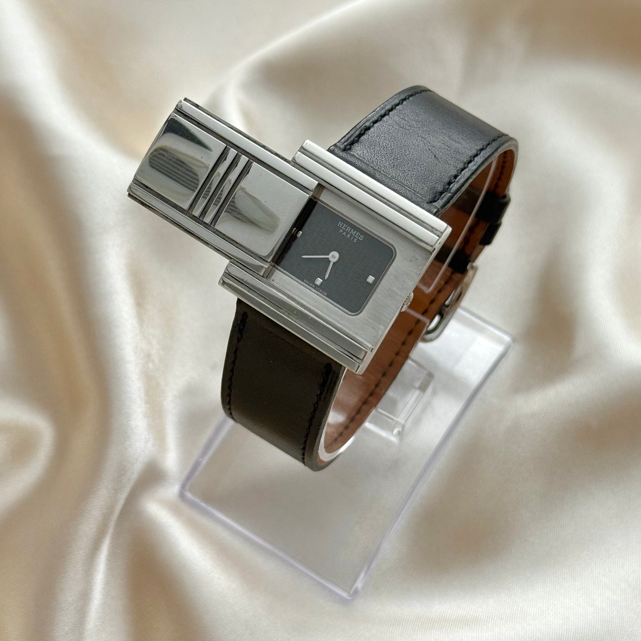 Beautiful and rare vintage Hermès watch featuring a square-shaped hidden stainless steel case, black hidden dial, and genuine leather bracelet. Comes with original box.