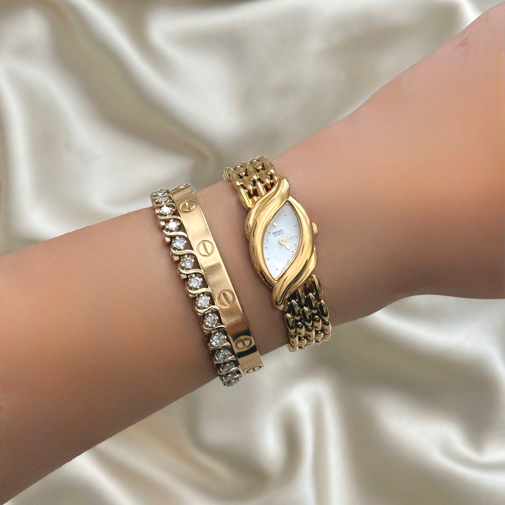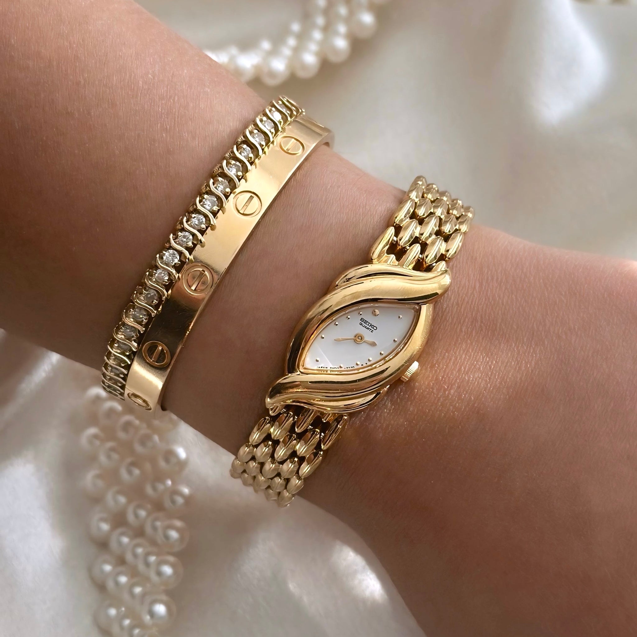 Stunning and rare vintage yellow gold-plated Seiko watch, featuring a unique shell-shaped asymmetrical case and a clean white dial. Finished with a bracelet clasp closure.