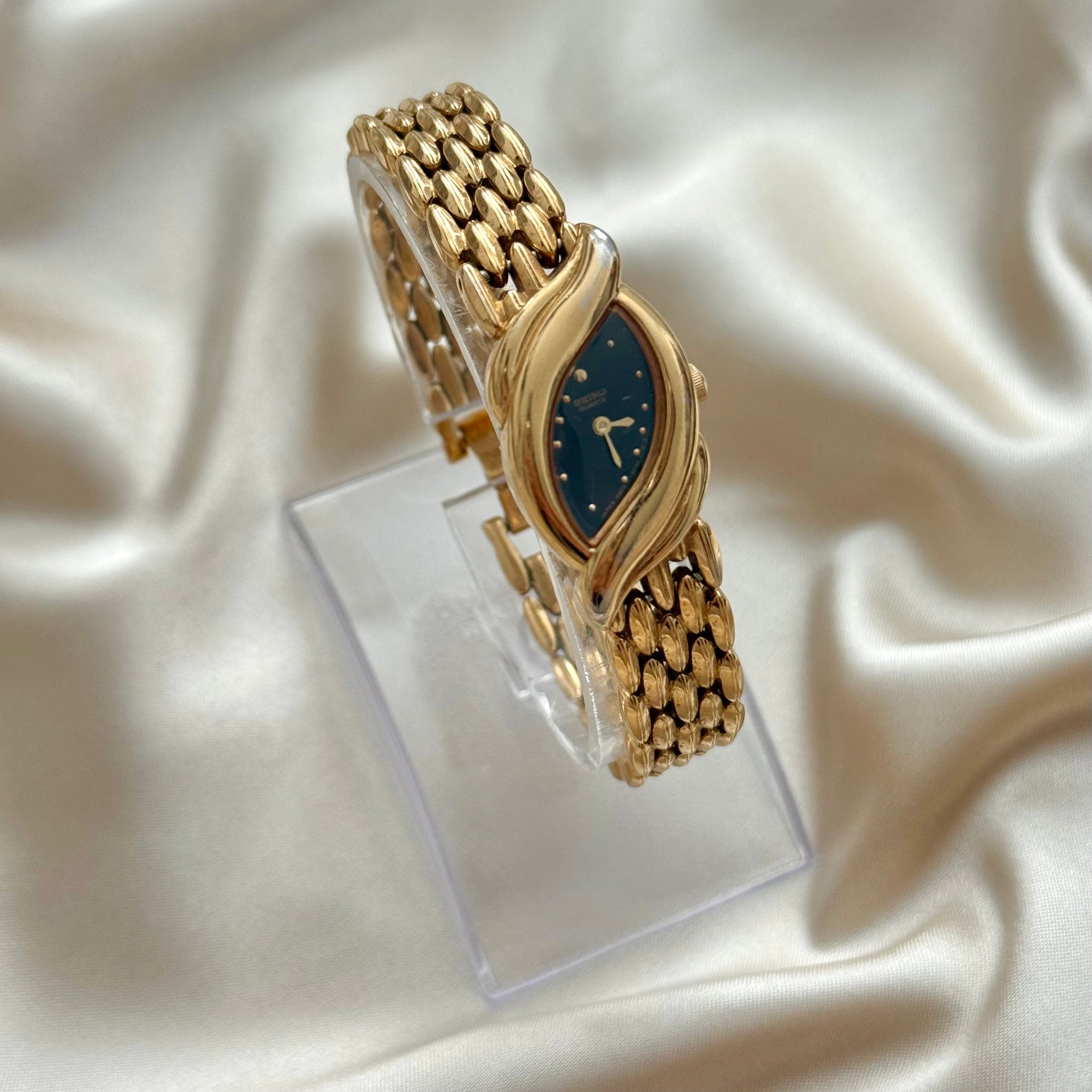 Stunning and rare vintage yellow gold-plated Seiko watch, featuring a unique shell-shaped asymmetrical case and a clean black dial. Finished with a bracelet clasp closure.
