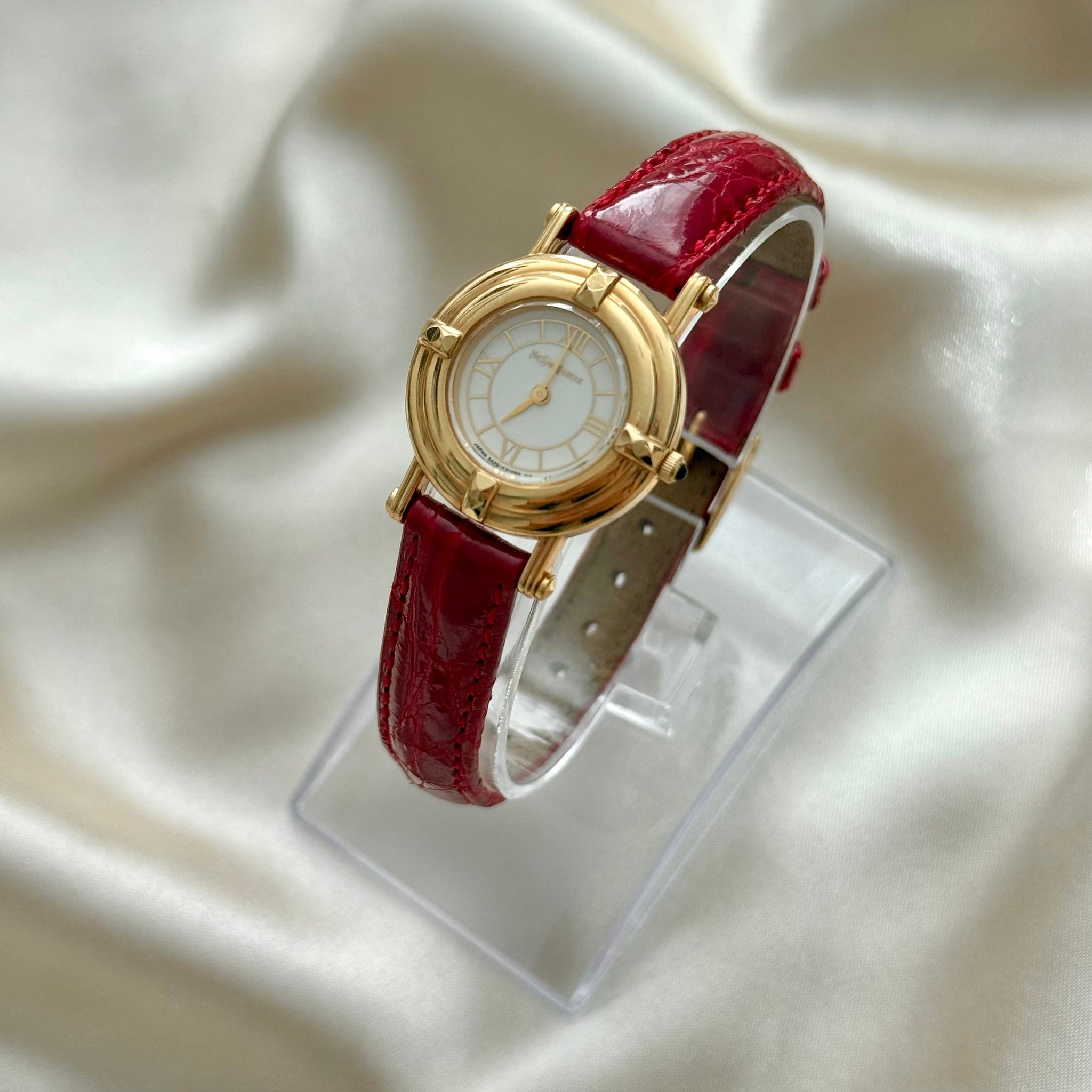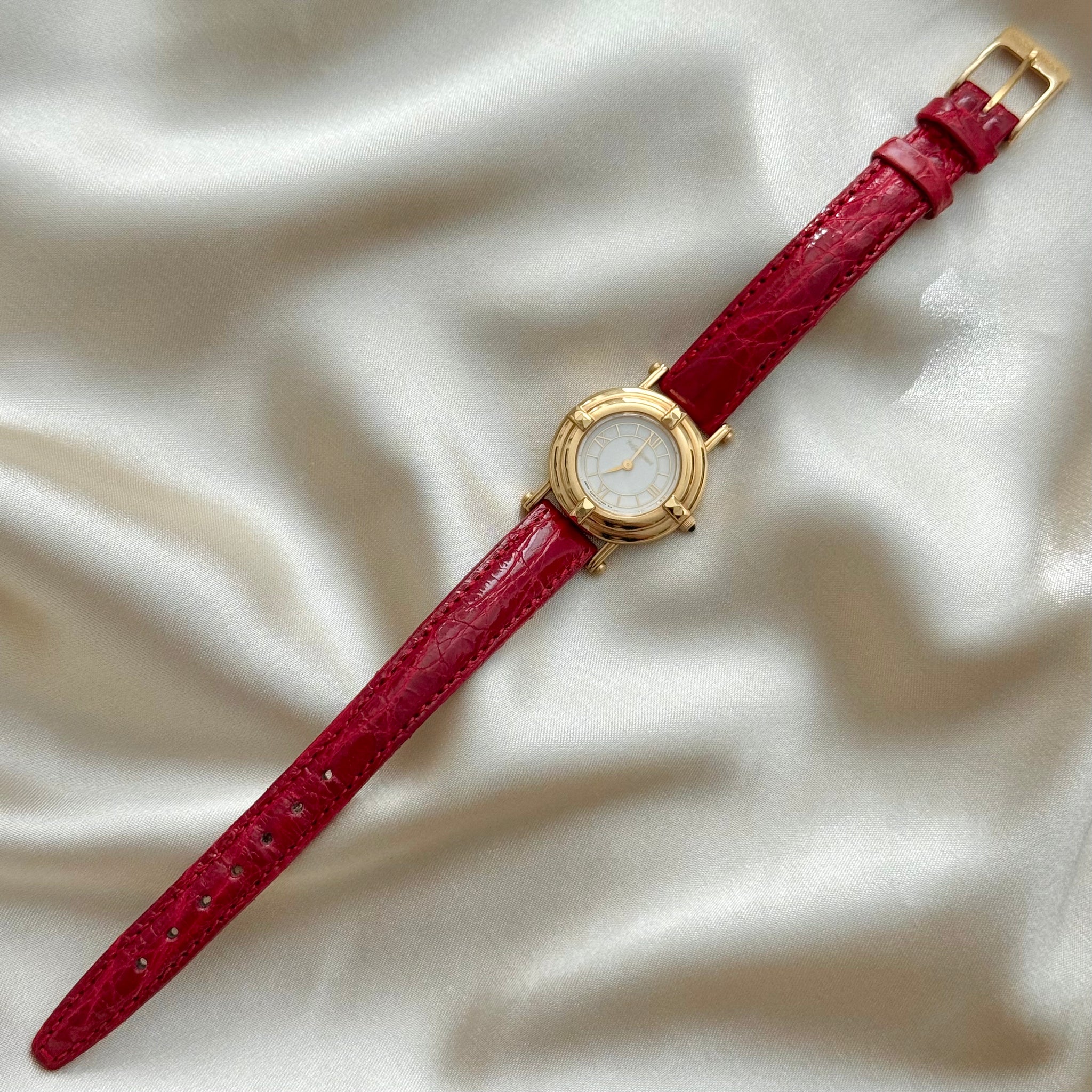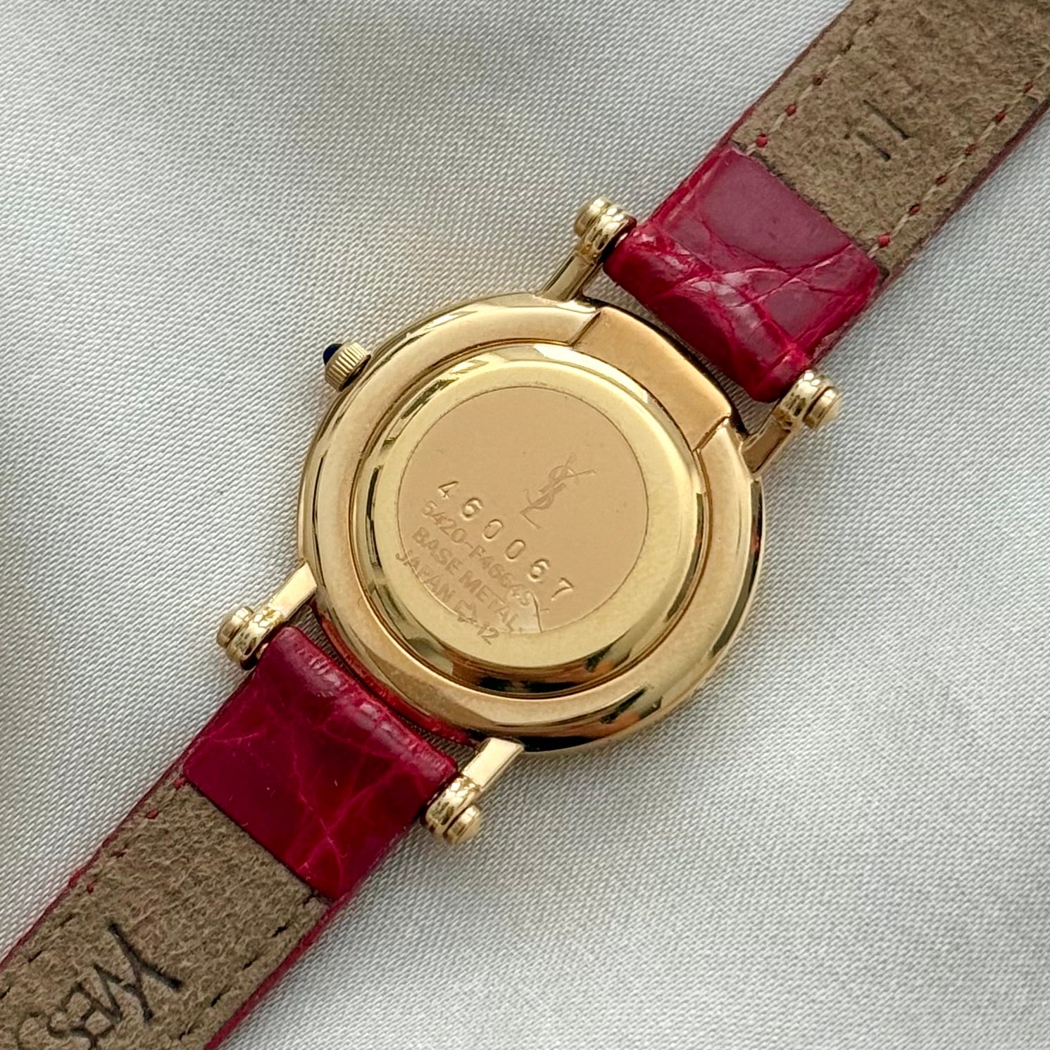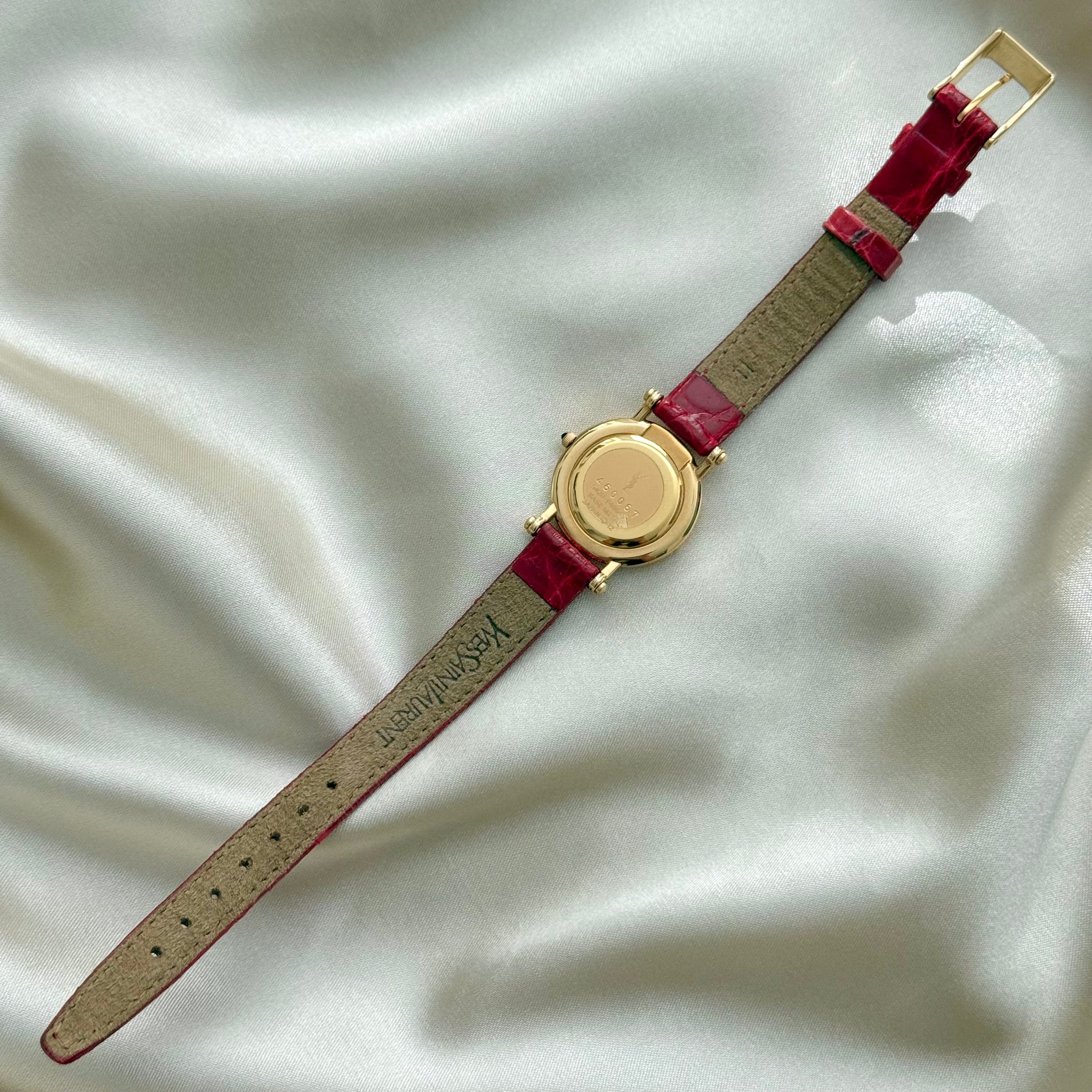 Incredible and rare vintage Yves Saint Laurent watch featuring a gold-plated round case, striking red leather bracelet, and an elegant gold and white dial.